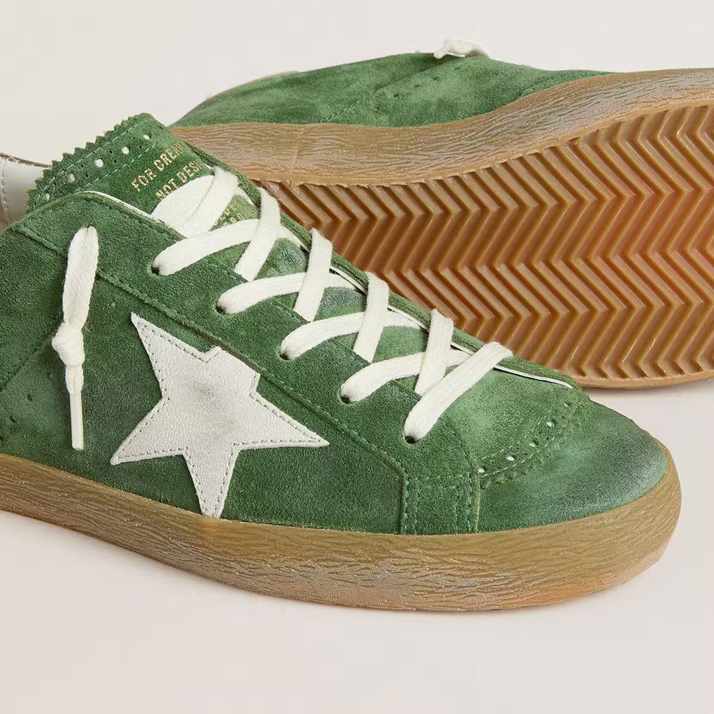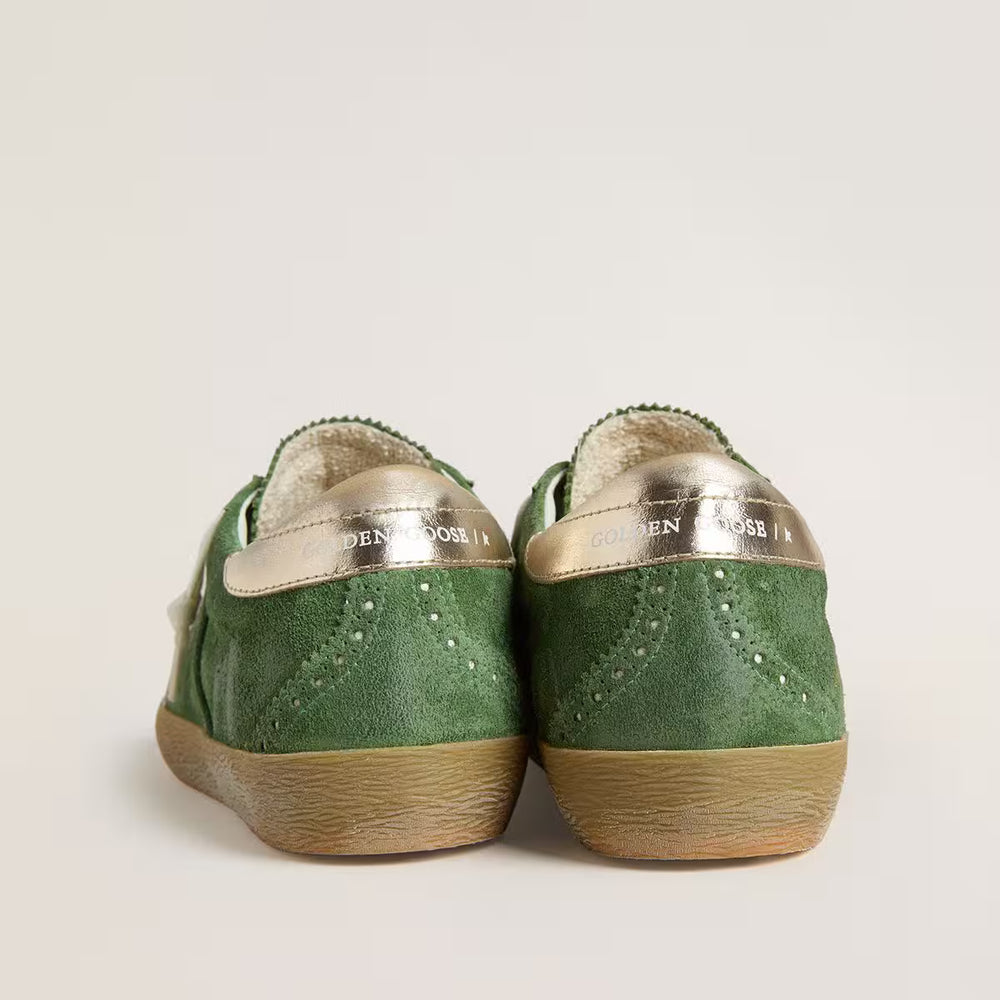 A timeless icon yet one that’s constantly evolving. At Golden, they love taking their classics and reworking them all the time, always from a new angle. These Super-Star with a green suede upper feature a white leather star and gold metallic leather heel tab. And white laces add the finishing touch.