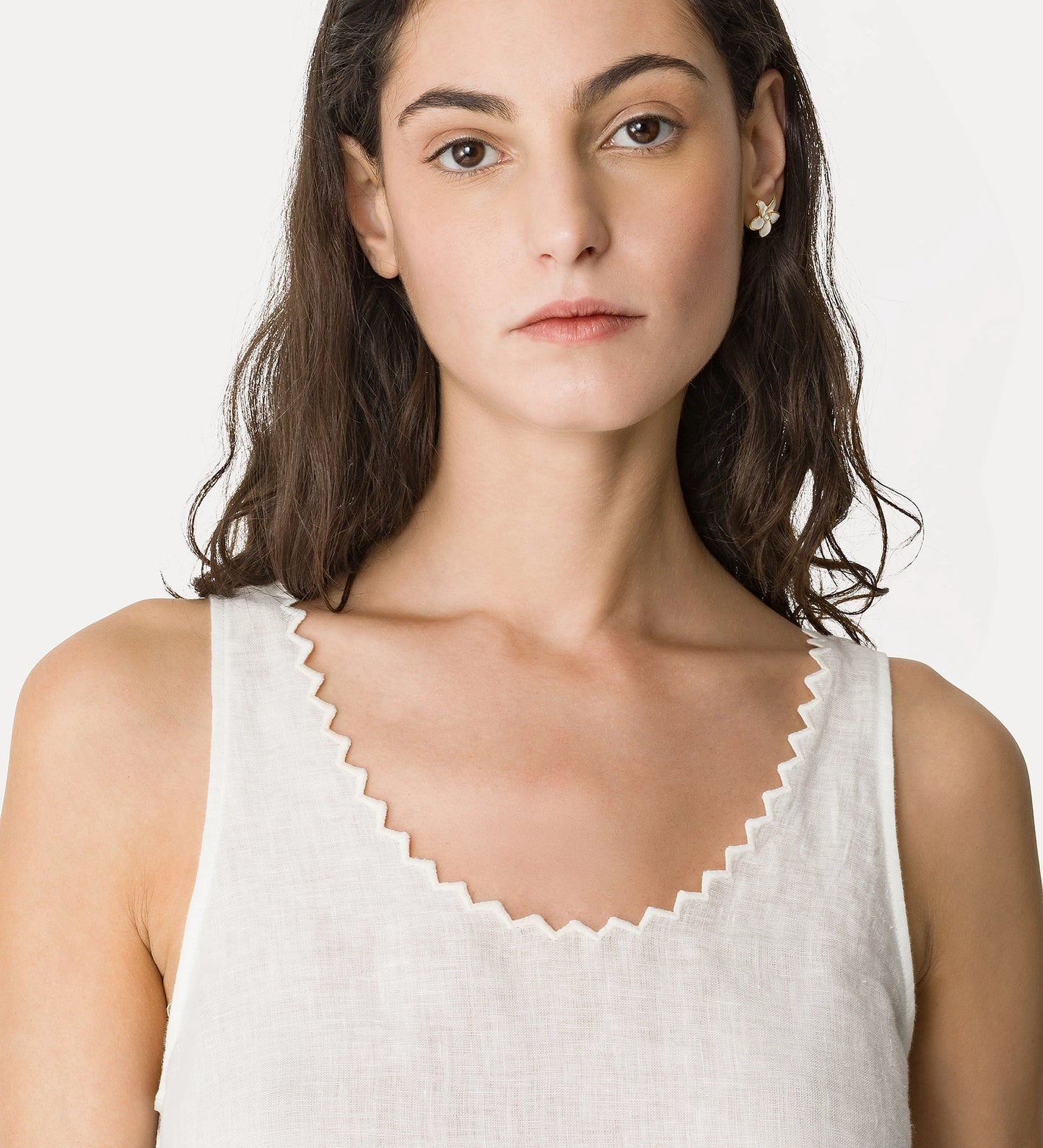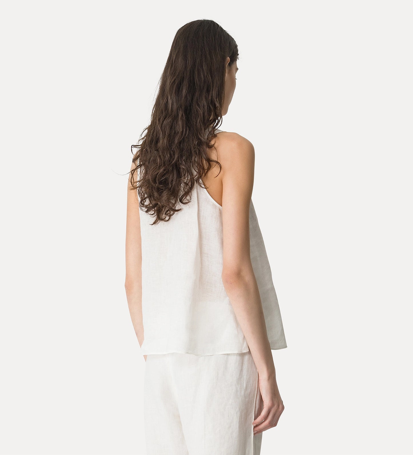 The poetic linen gauze sits on the skin like the first ray of summer sunshine, creating a chic embroidered top with a romantic silhouette. Its rounded neckline, bare shoulders and small side overlay with tone-on-tone details make it a versatile garment with a clear identity: a versatile and elegant summer top that can be worn time and time again.