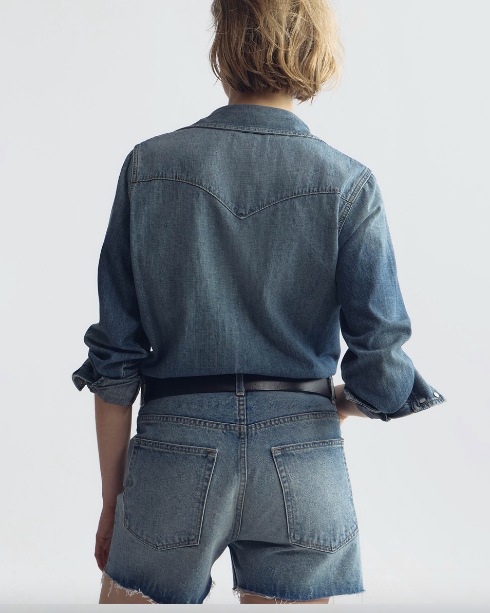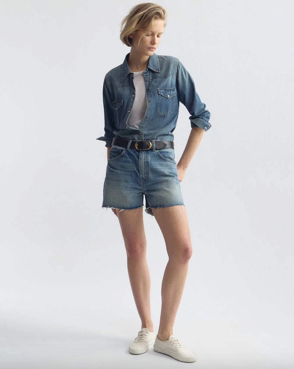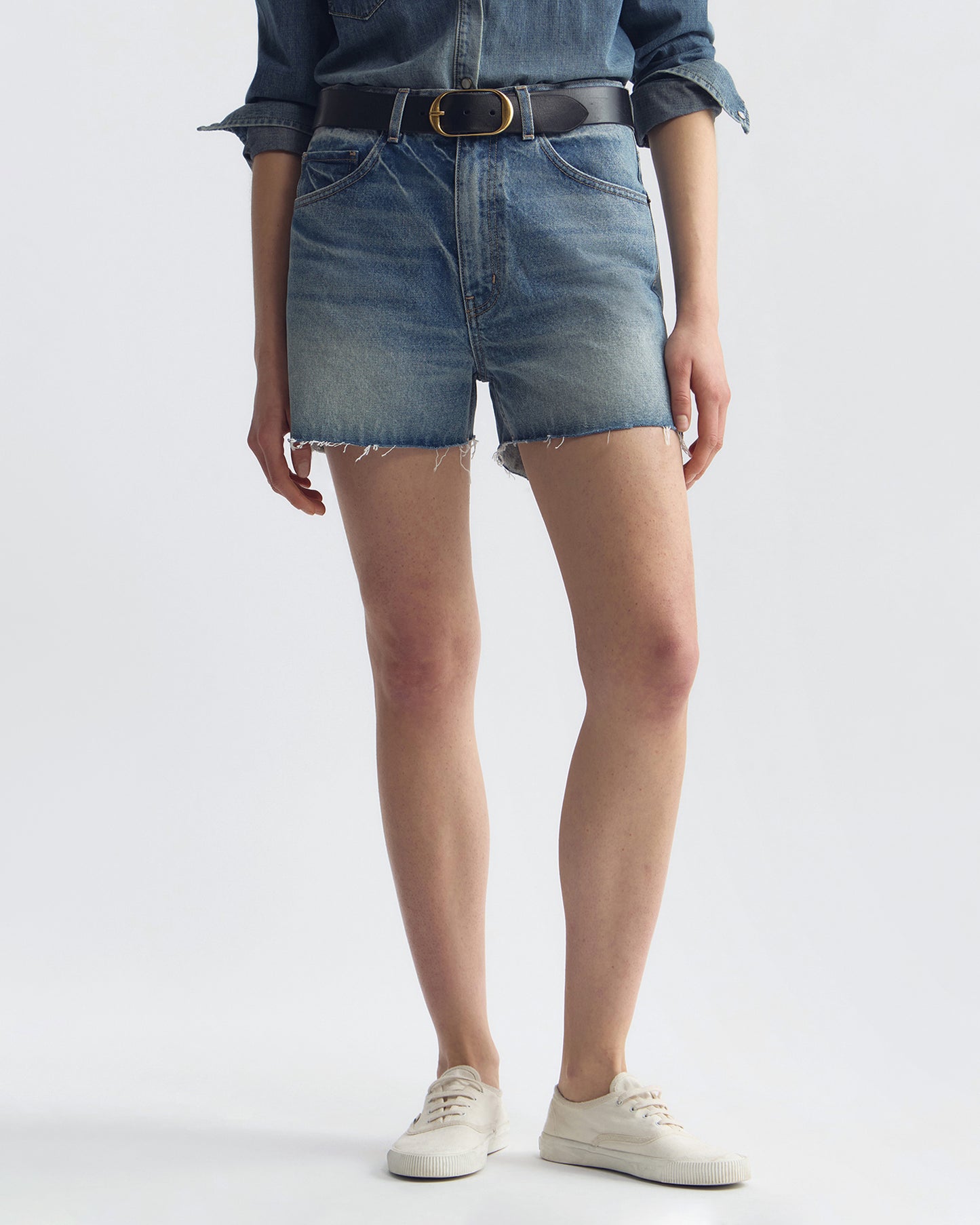 ow-rise relaxed leg jean short in Japanese non-stretch denim. Five pocket detail. Fly zip. Shank closure. Raw hem. Natural fray. Belt loops.