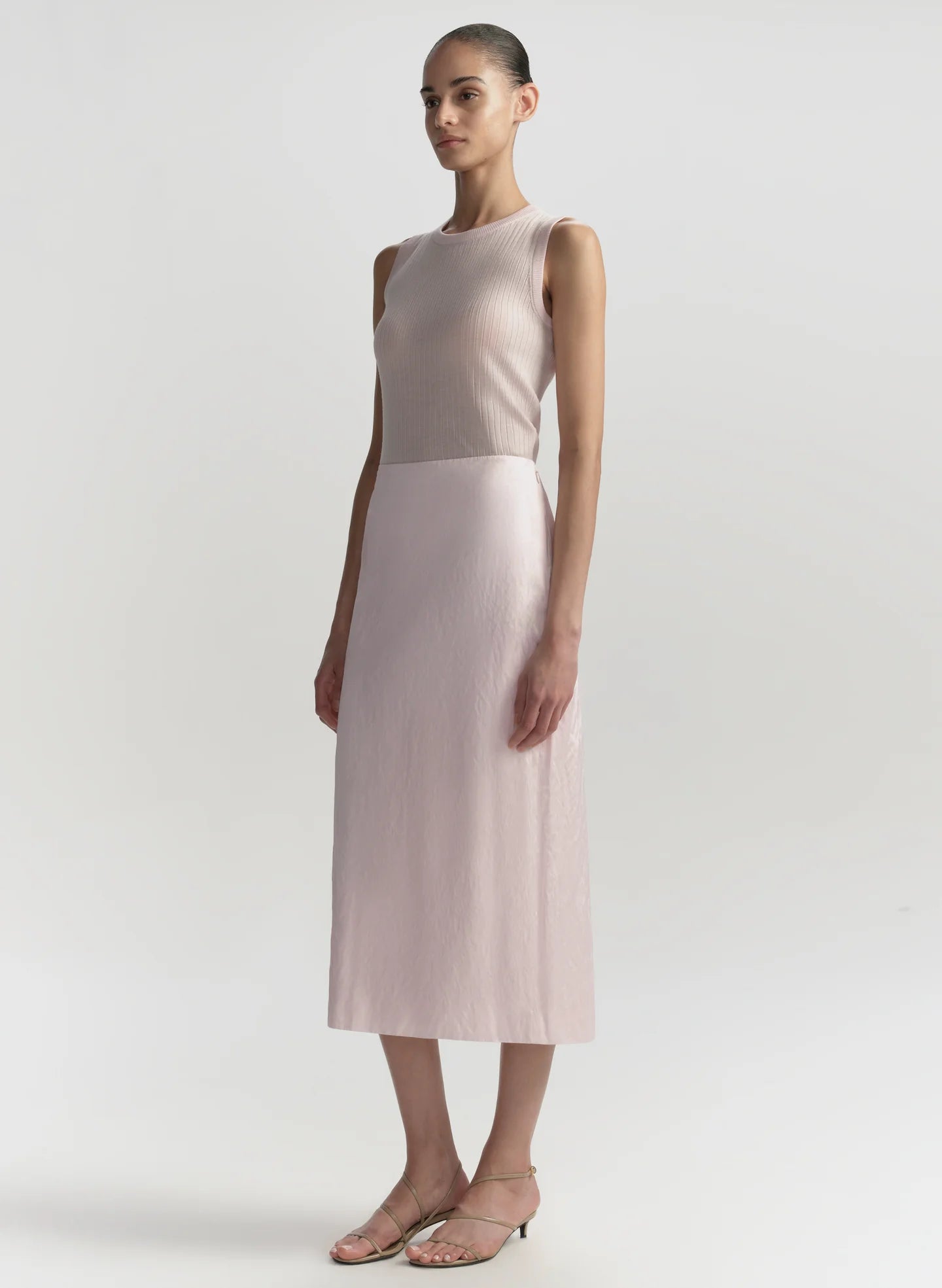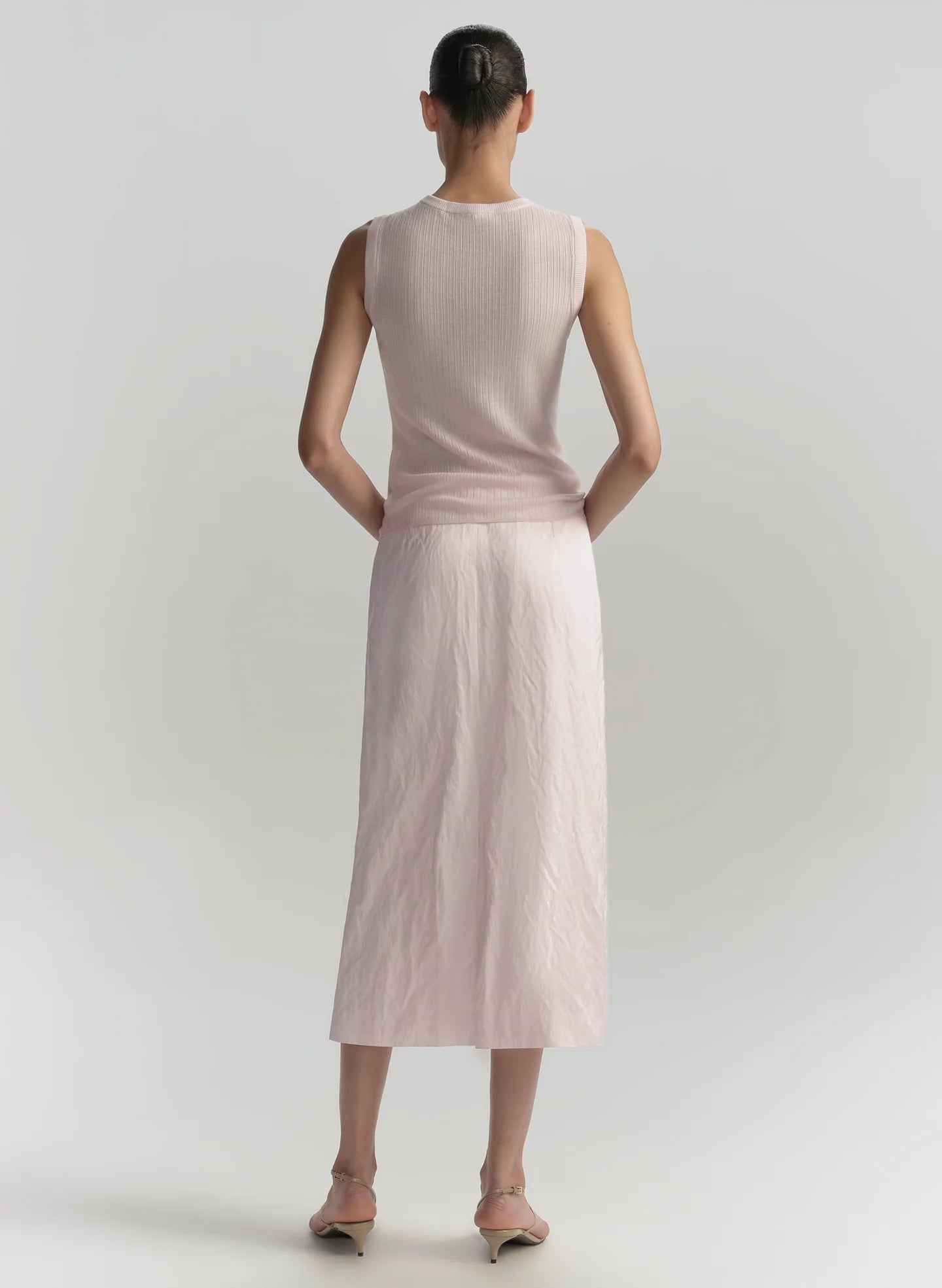 The Mick Top in Cherry Blossom is the sleeveless knit your wardrobe will lean on season after season. Crafted from ultrafine Italian merino wool, it’s soft, lightweight and designed for effortless layering. The fitted crewneck silhouette and ribbed texture create a clean, streamlined look - polished enough for tailoring, yet sleek enough to wear on its own.