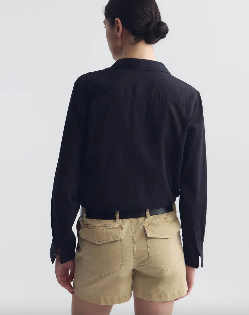 A slim ruffle front blouse in a midnight-coloured Indian cotton voile. Hidden placket. Ruffle front detail. Custom logo buttons at front and sleeves. Back yoke. Easily able to tuck in.