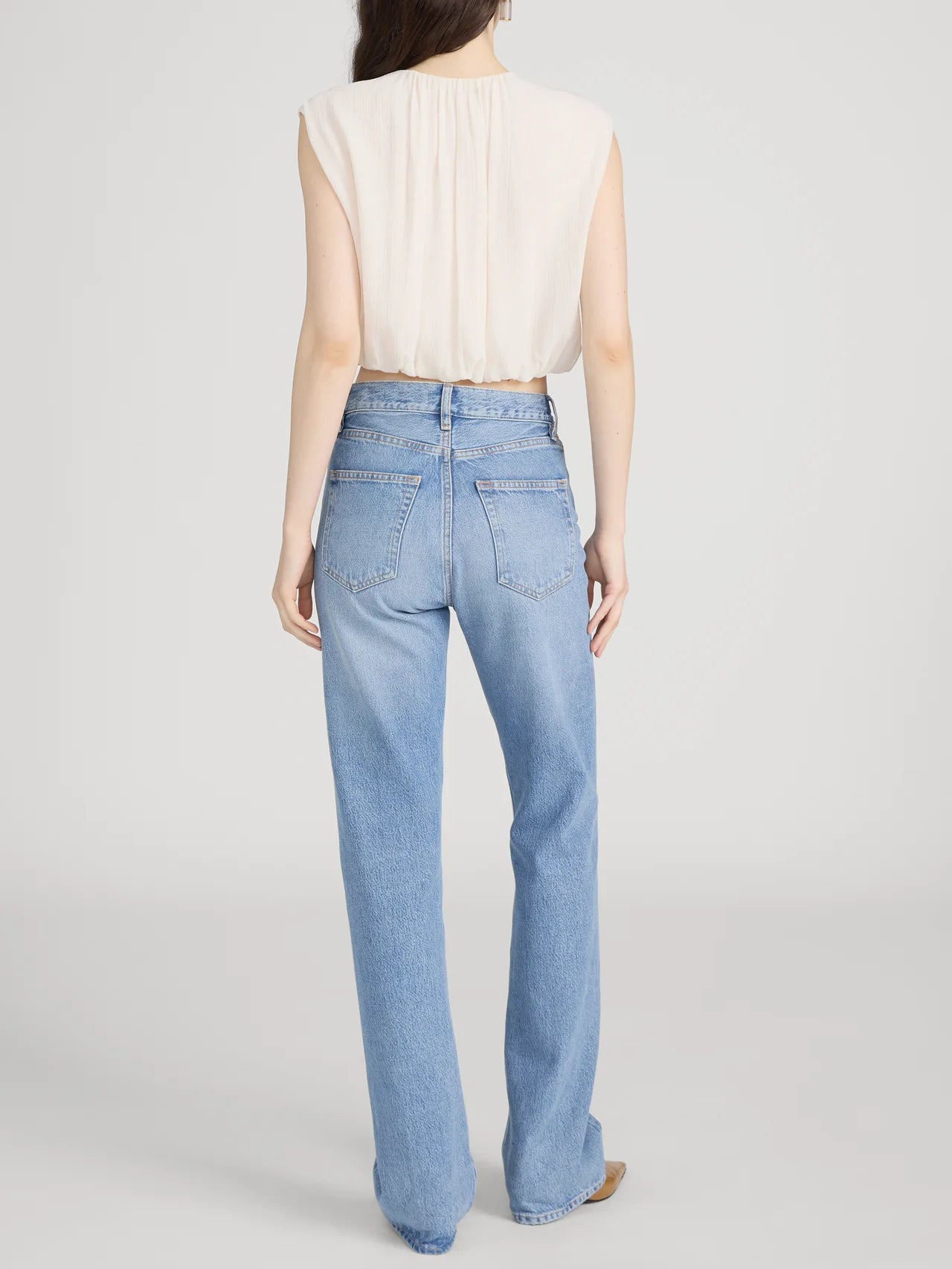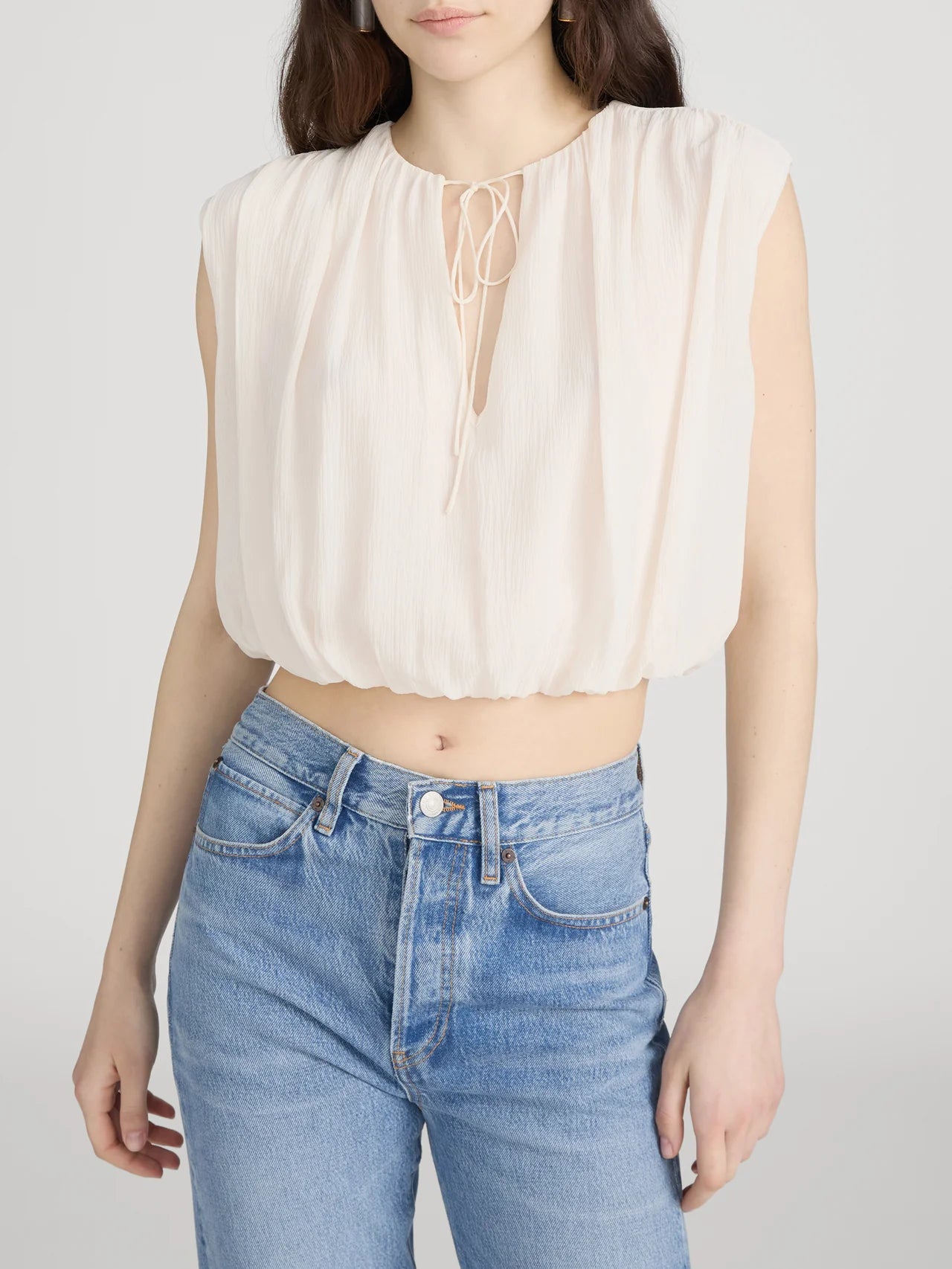 The Wave Top is crafted from 100% silk with a soft, airy drape. Designed in a relaxed, cropped silhouette, it features a gathered neckline with a delicate tie closure and a softly blousoned hem for effortless movement.