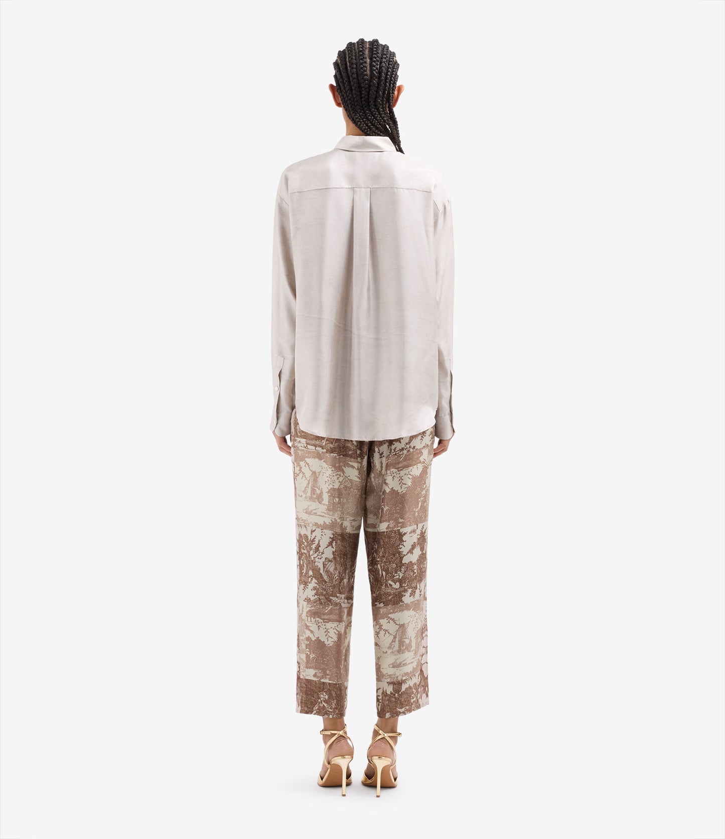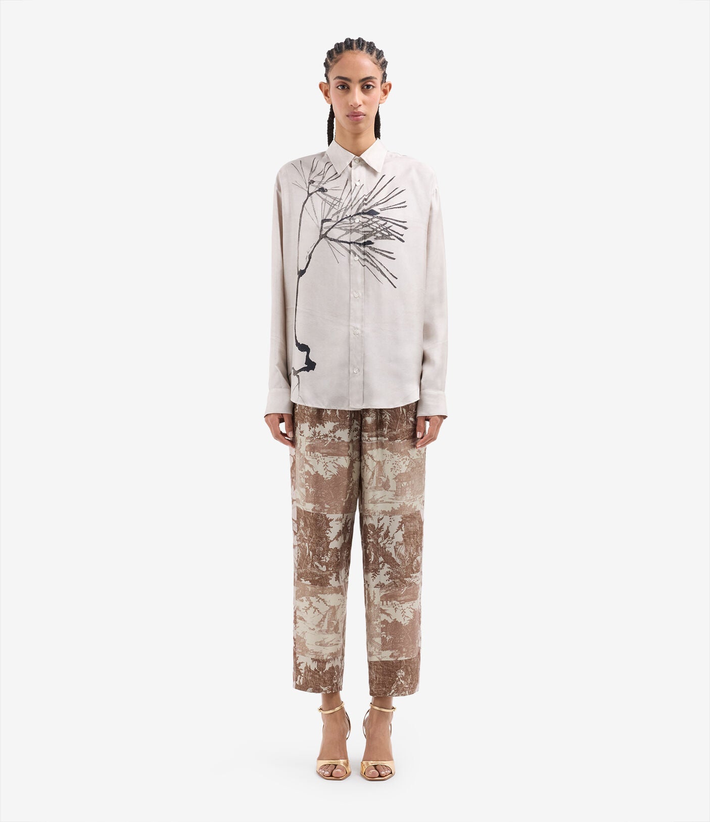 This exquisite silk shirt features a relaxed fit with a classic collar and buttoned cuffs, adorned with an artistic black brushstroke motif on a soft beige backdrop, evoking serene elegance. The fluid fabric and minimalist design offer a harmonious blend of art and fashion, perfect for a sophisticated look.