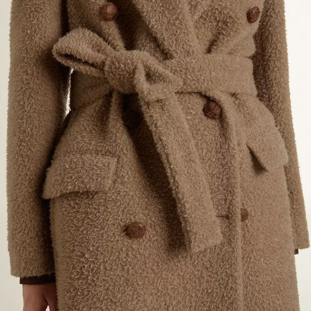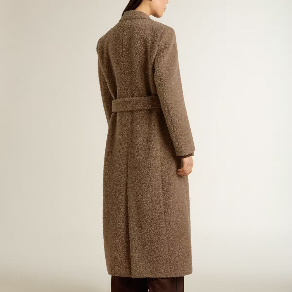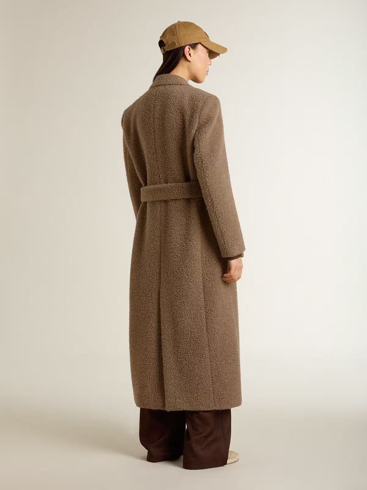 Unfolding like a relaxed and refreshing journey, this double-breasted coat in a beige wool blend features a brown leather button fastening, two front pockets and a belt at the waist.