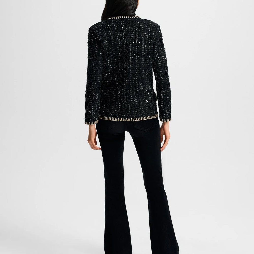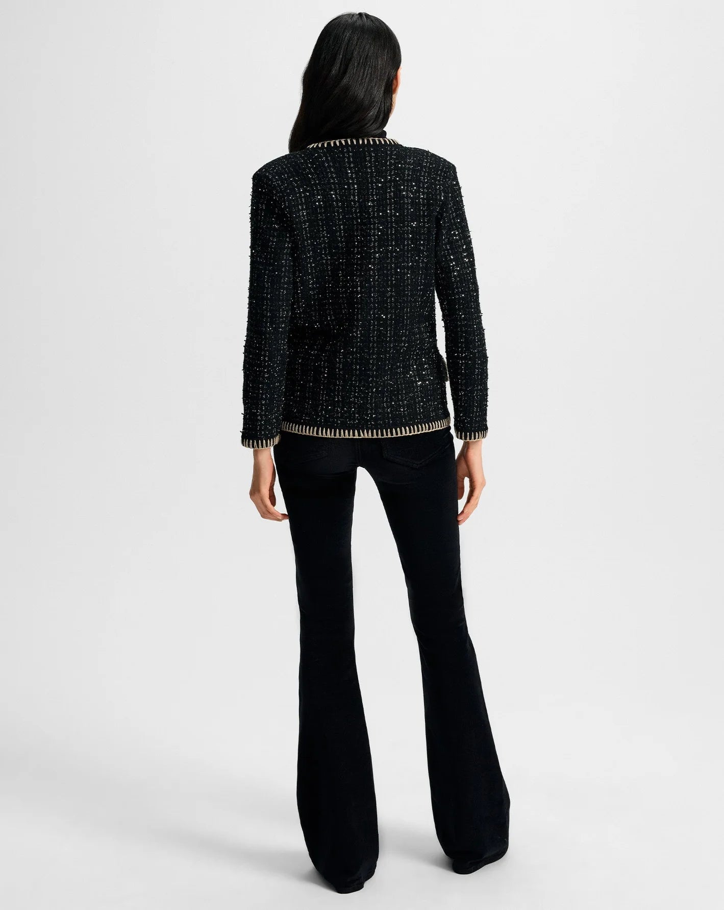 The ease of a cardigan, the polish of a jacket. Crafted from a black tweed knit, the Ceriani features a deep V-neckline, bezel-style buttons, flap pockets and contrast metallic blanket stitching along the trim. Perfectly polished yet versatile, it pairs just as well with an LBD as it does with jeans.