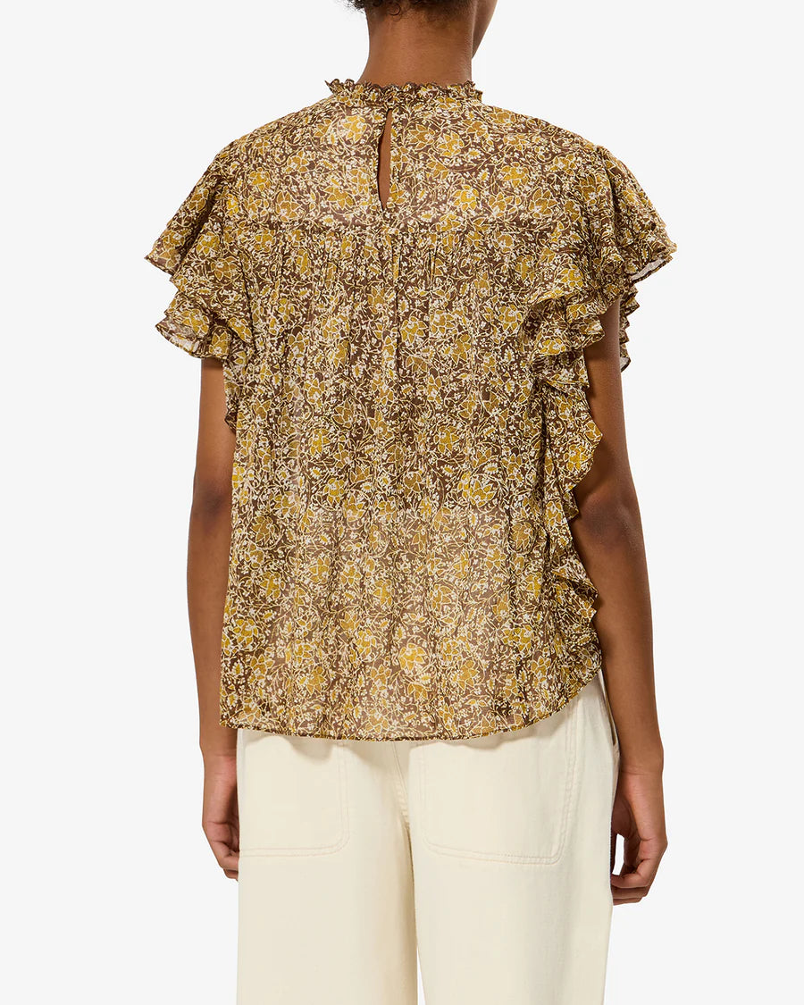 A sleeveless cotton voile blouse featuring a round neckline with a gathered pleated front and shoulder details.