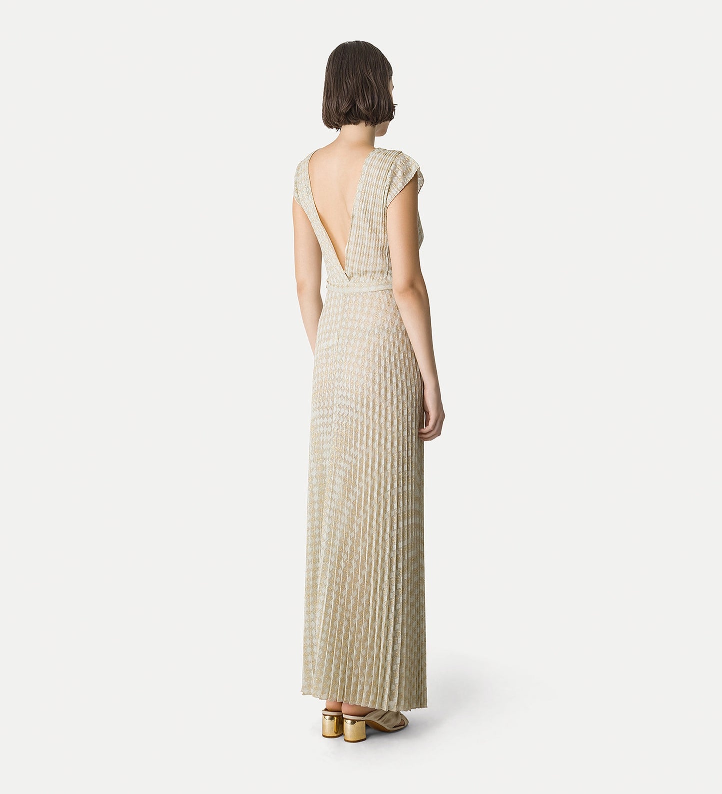 A delicate pattern like a light texture adorns this pleated dress in diamond jersey, with feminine lines and a softly flared skirt. Naturally elegant, this long dress reveals the neckline with a v-cut both in front and at the back, enhanced by a fitted bodice and gently flaring skirt. The lurex thread running through the jersey adds a luminous, subtly glamorous touch.