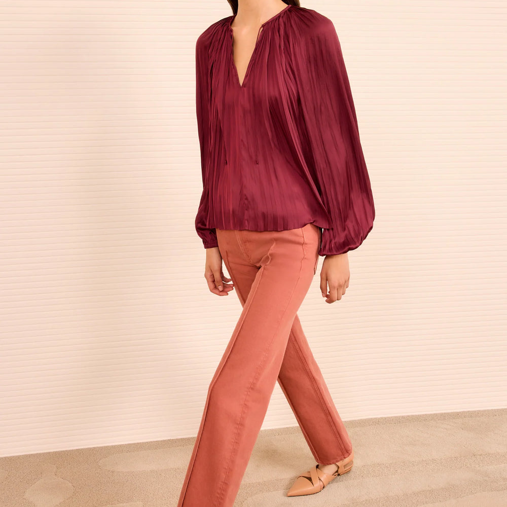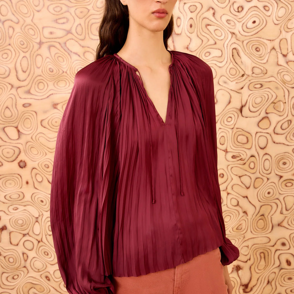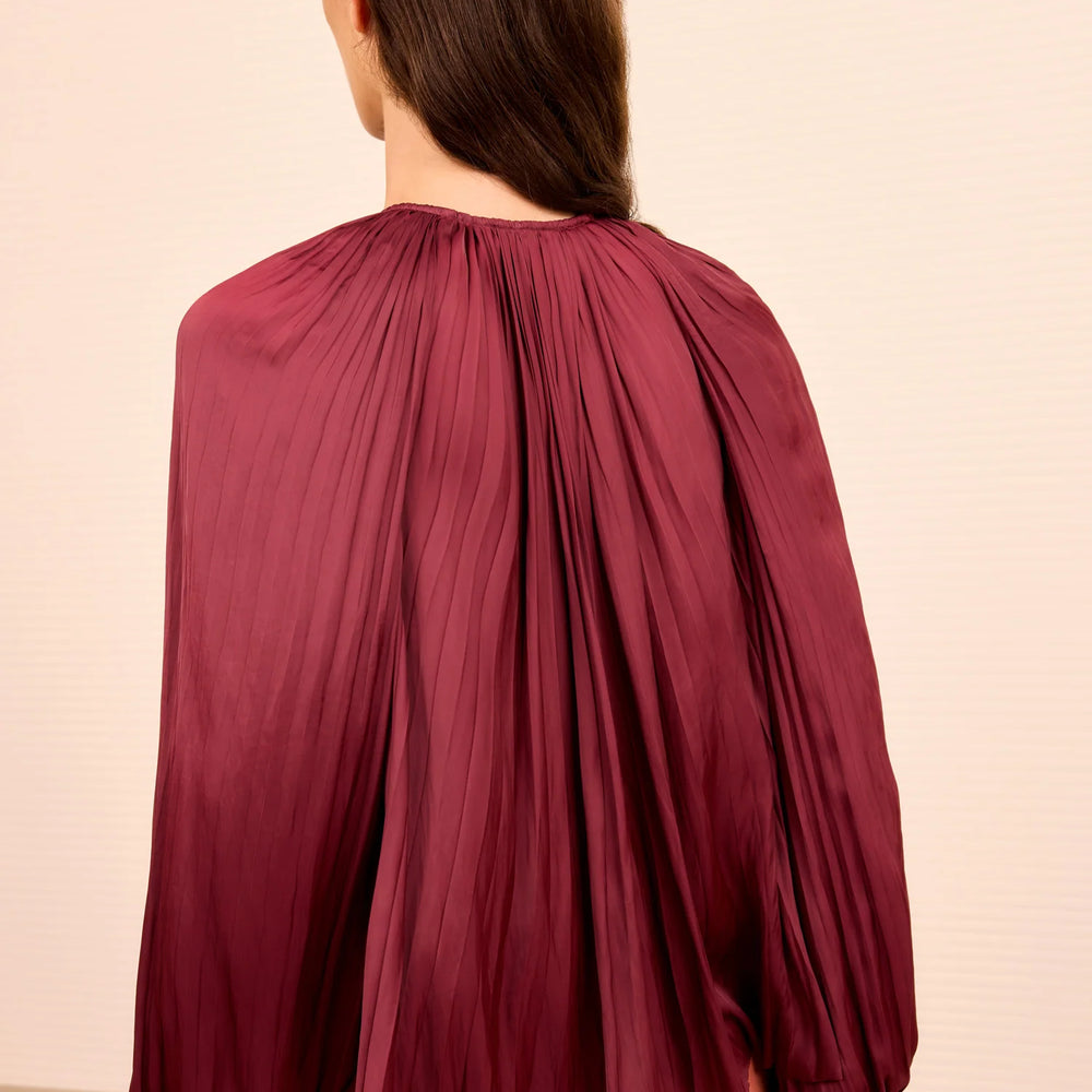 The Electra Blouse is a wardrobe staple, pleated throughout from smooth plissé satin in a rich claret red. It has a fluid, effortless fit and neckties that can be fastened or left undone for a more relaxed feel.