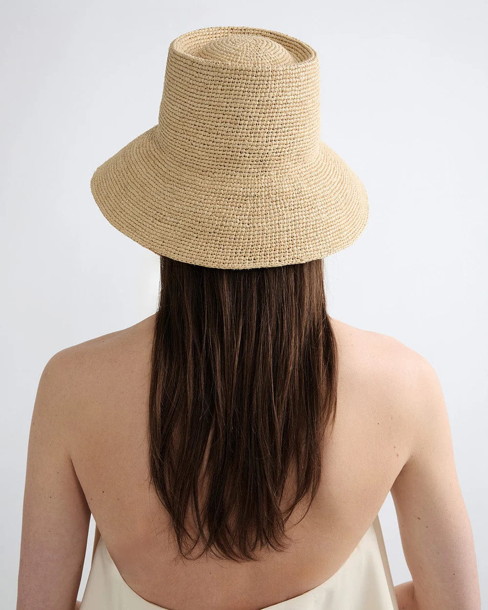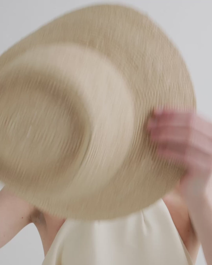 A raffia straw bucket hat made for summer. This short-brimmed crochet bucket hat was intricately crocheted to create a flexible and structured design. This effortless bucket hat can easily be worn year-round and is meant for traveling with you wherever you go whether in a suitcase, a purse or a beach bag.