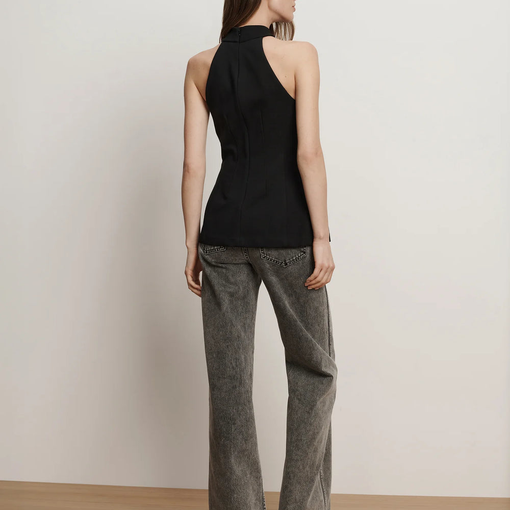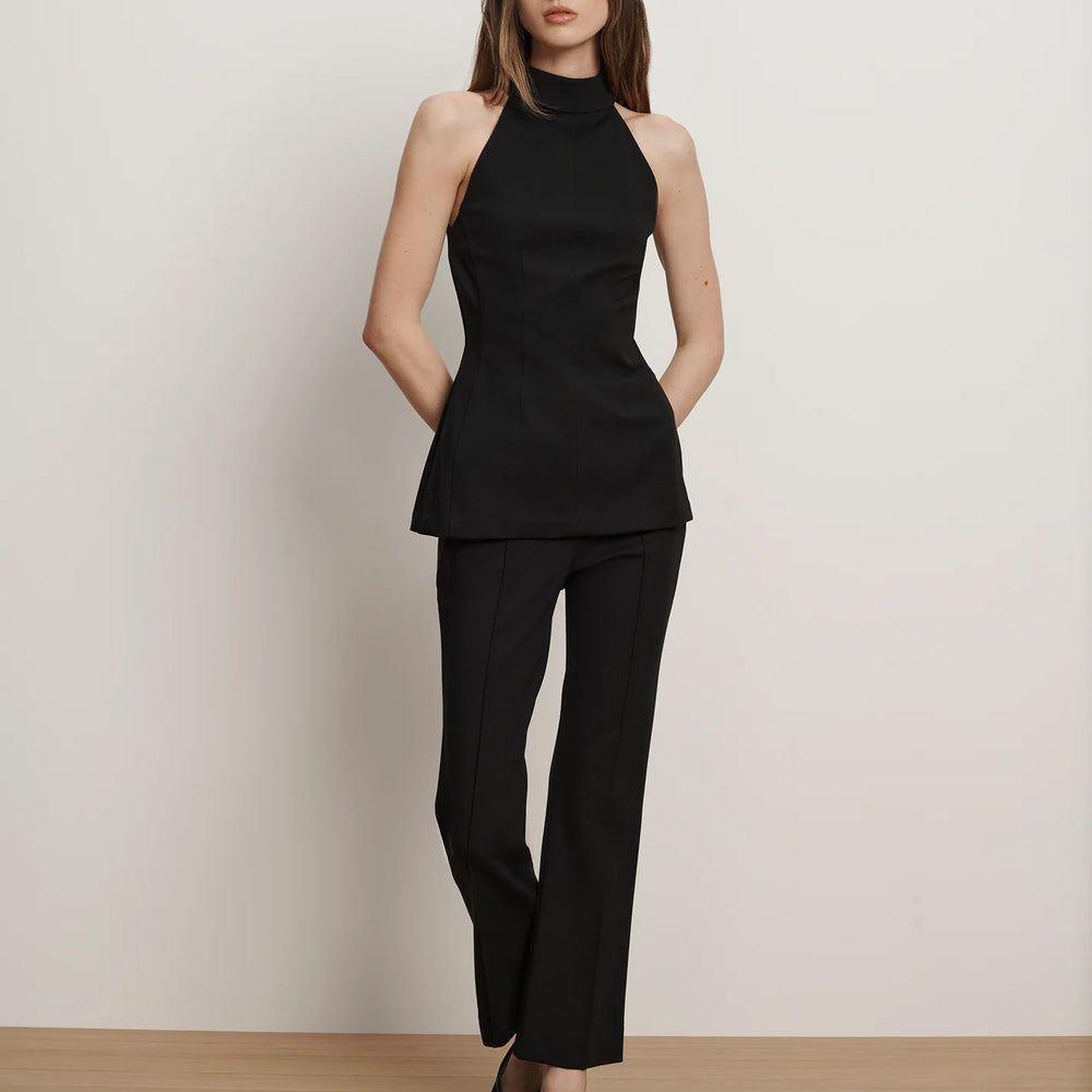 Sleek and sophisticated. Crafted from a premium stretch blend in black, the Johanne top features a halter neckline with waist and back darting for a flattering fit, finished with a back zip closure. Pair this sleeveless top with the coordinating pants for a chic set or layer over a maxi skirt for evening.