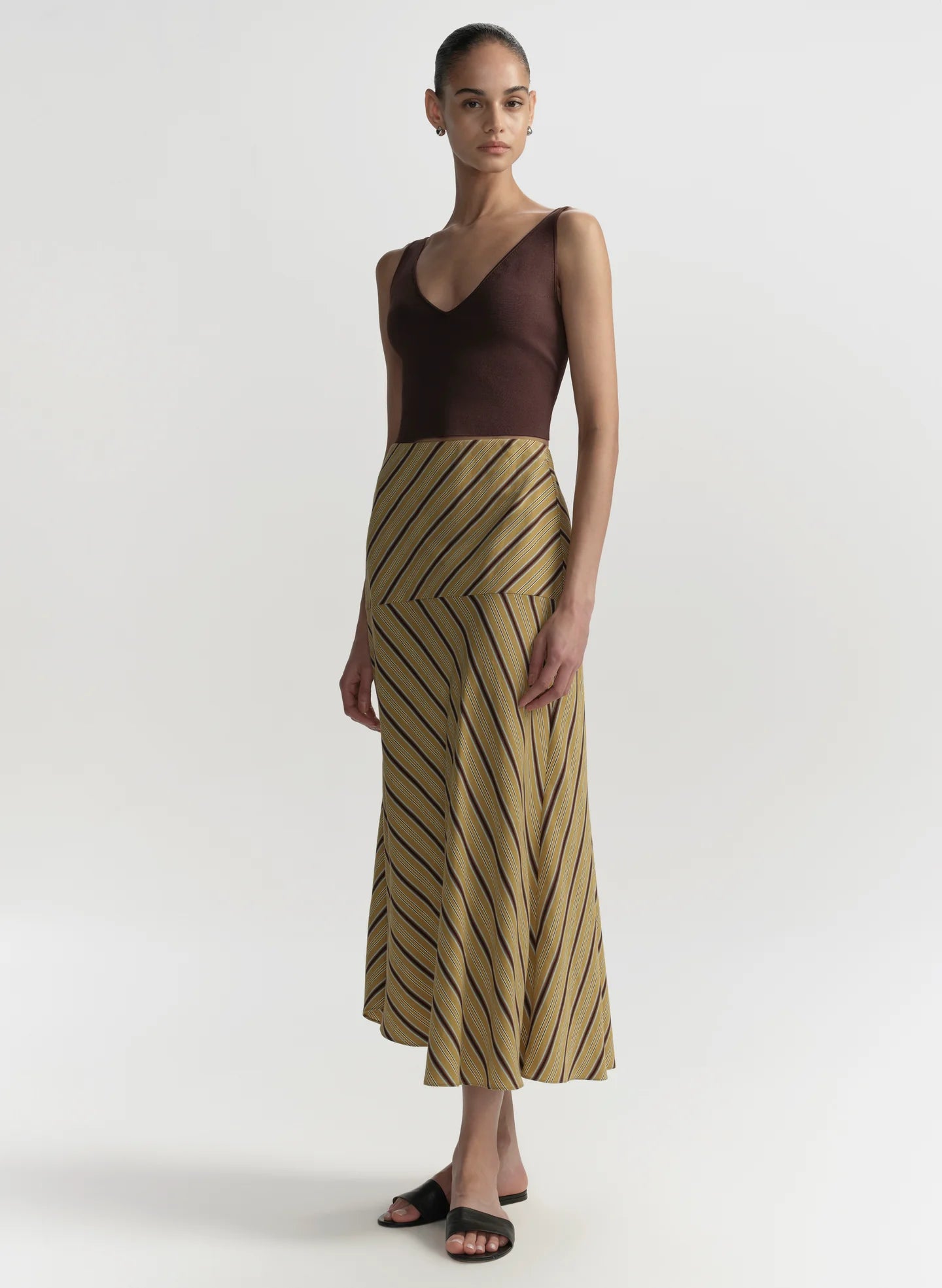 The Kara Skirt is crafted from barre stripe shirting in a curry and ganache-brown palette. This style features a high-rise waist with a zipper closure and a fluid midi-length silhouette.