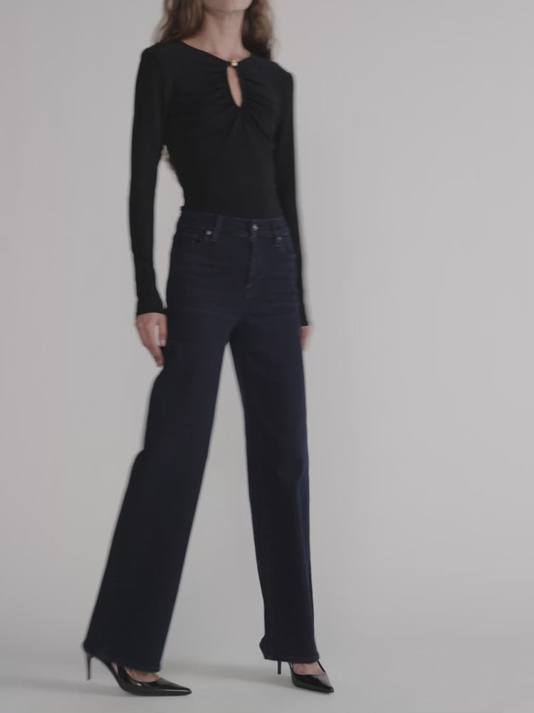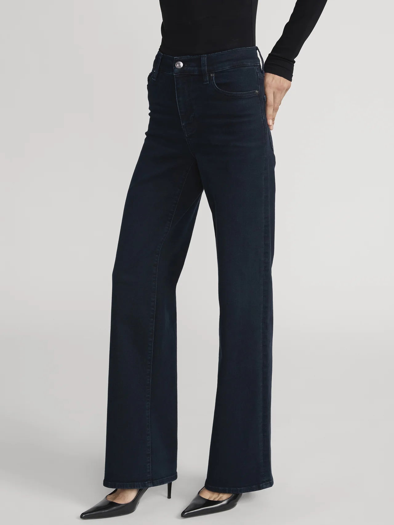 This bestselling silhouette is designed with a flattering high-rise waist, fitted hip and subtle wide-leg flare that hits at the floor. Crafted from sustainable, super-stretch denim for effortless all-day wear.