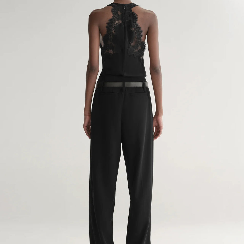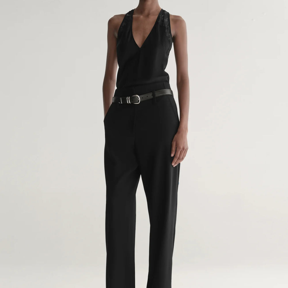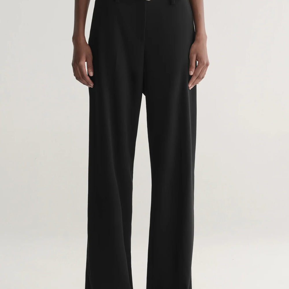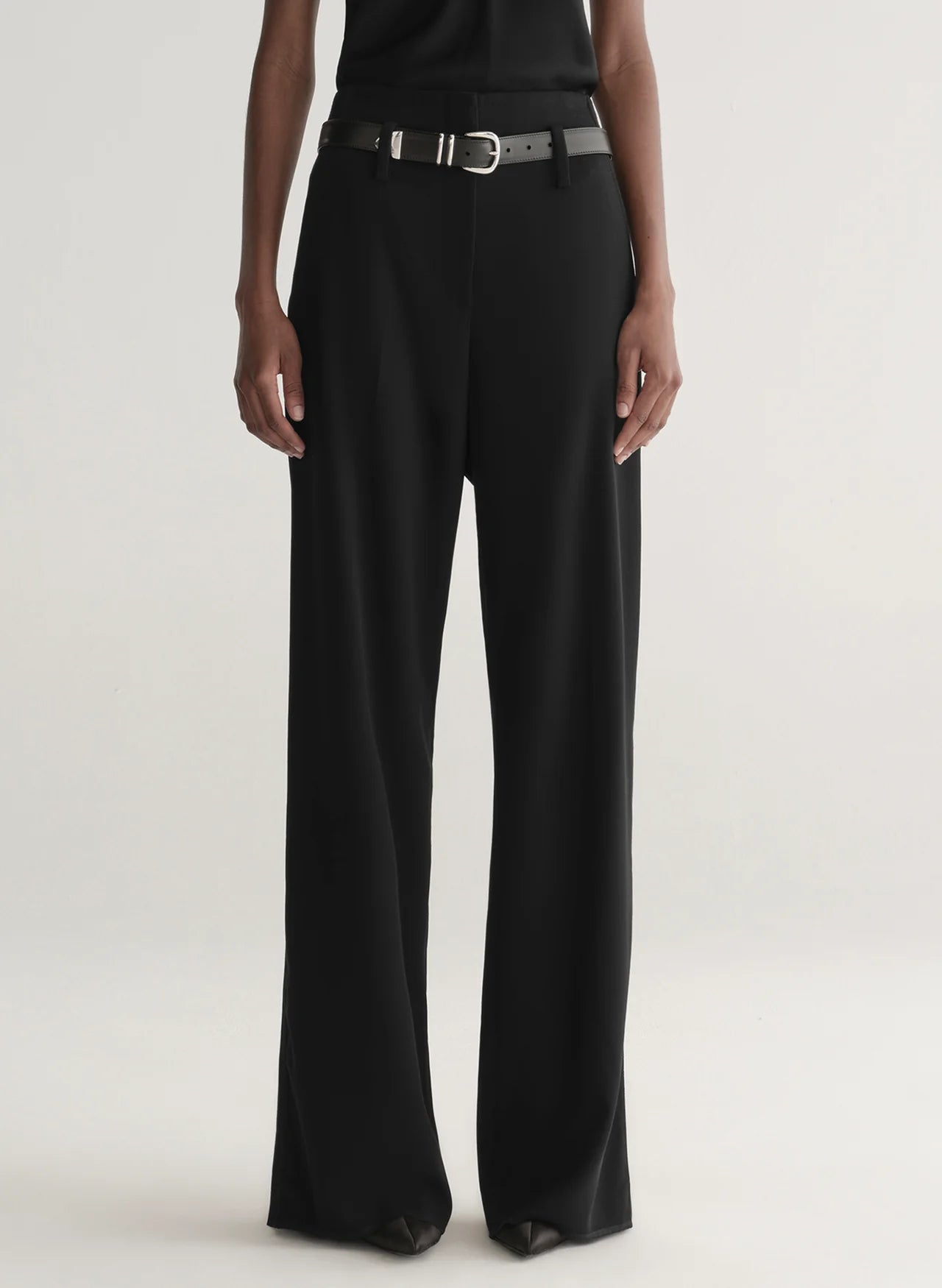 A relaxed silhouette rendered in drapey wool gabardine with a mid waist and straight leg that falls with soft structure and fluid movement.
