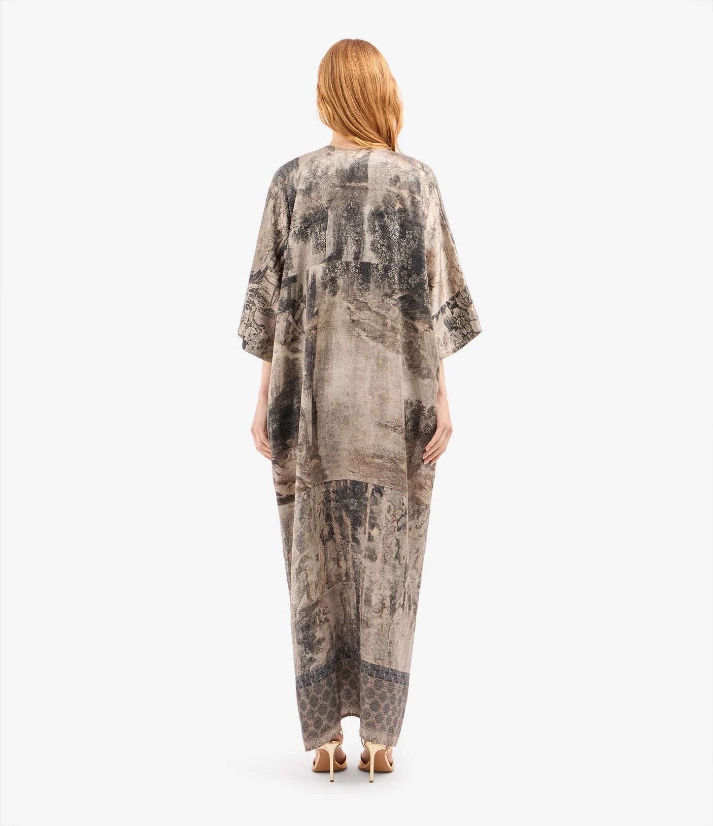 This sumptuous silk kaftan robe features a flowing silhouette with wide sleeves and a serene, earth-toned abstract pattern reminiscent of a dreamlike landscape. The muted palette evokes a sense of calm and elegance. Perfect for layering over a simple slip dress or pants to create an effortlessly sophisticated ensemble.