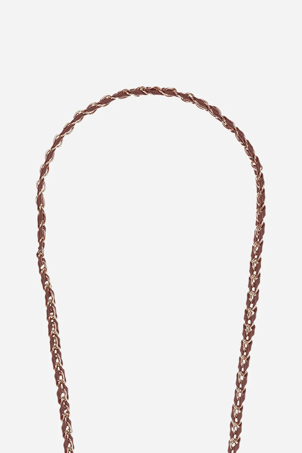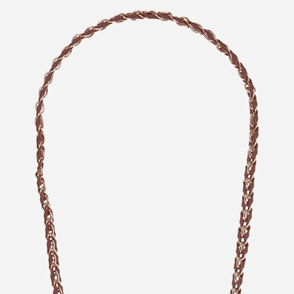 The Lou Bordeaux phone chain, made of gold-plated metal and hand-braided burgundy vegan leather, is 120 cm long and clips onto ring cases or an adapter with its gold carabiners. It is designed in Marseille and handcrafted.