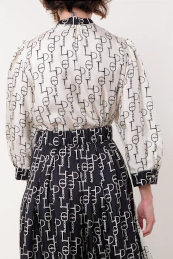 Shirt in silk twill, fully buttoned on the front, balloon long sleeves with a rising collar split at the back of the neck, gathers on the back and mother-of-pearl buttons. Exclusive print “Chainette” in contrasting colours at the neck and wrists.