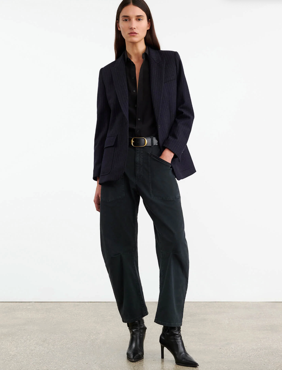 A mid-rise, relaxed fit barrel leg pant. Uniquely curved silhouette. Seam detail at knees. Gusset at inseam. Zip fly. Hidden hook-and-bar closure. Hidden stay button closure. Top-stitched front and back patch pockets. Belt loops.