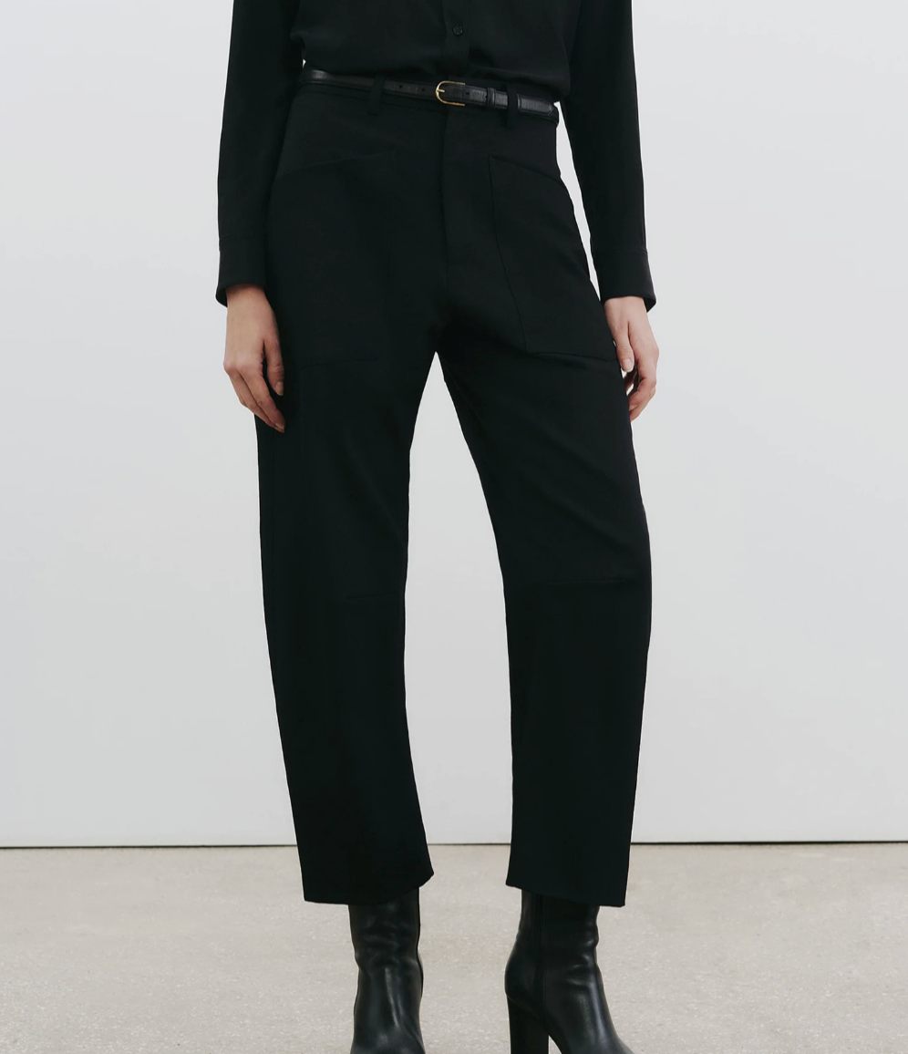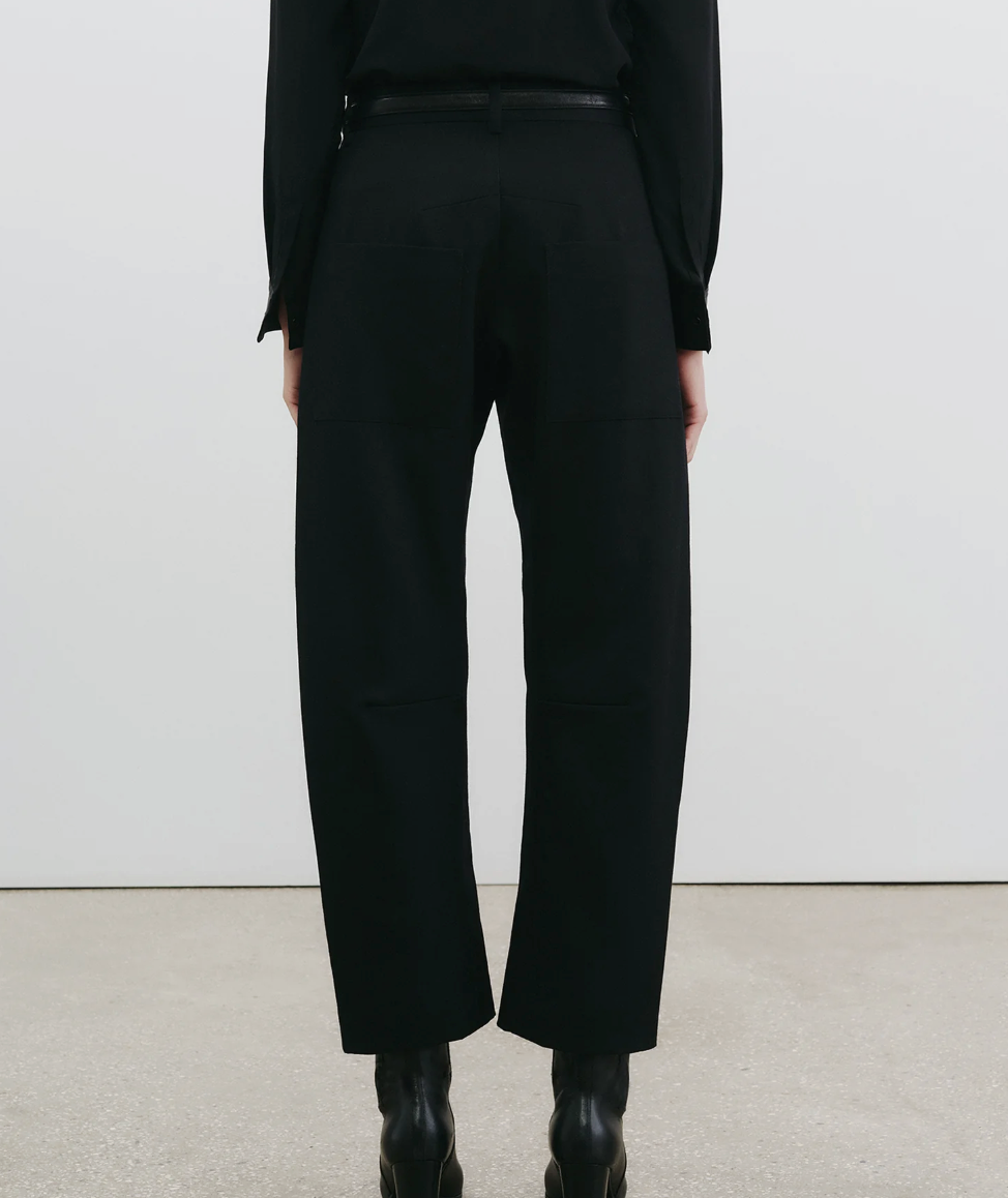 Mid-rise, relaxed fit barrel leg pant. Uniquely curved silhouette. Seam detail at knees. Gusset at inseam. Zip fly. Hidden hook-and-bar closure. Hidden stay button closure. Top-stitched front and back patch pockets. Belt loops.