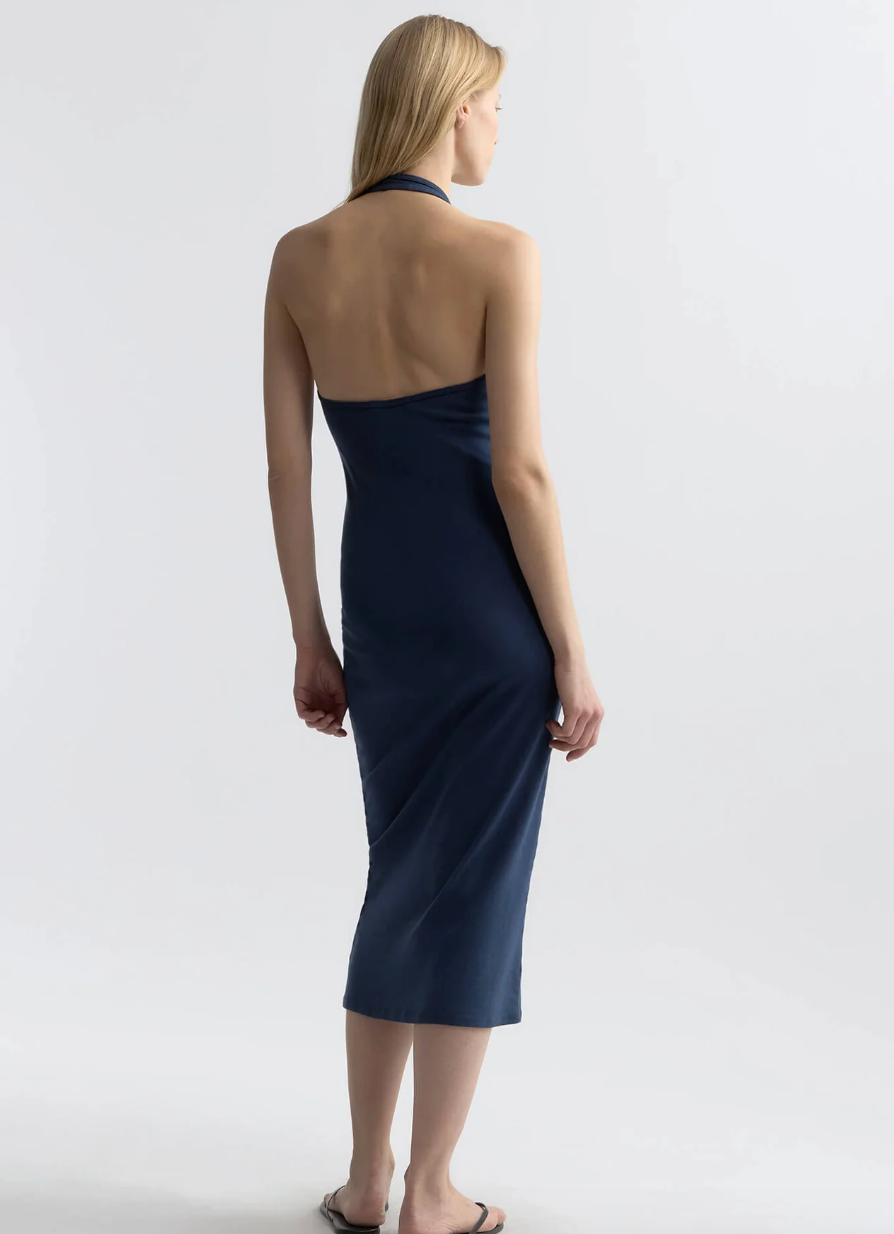 A slim fit baby rib halter mid-length dress in cotton with an open back.