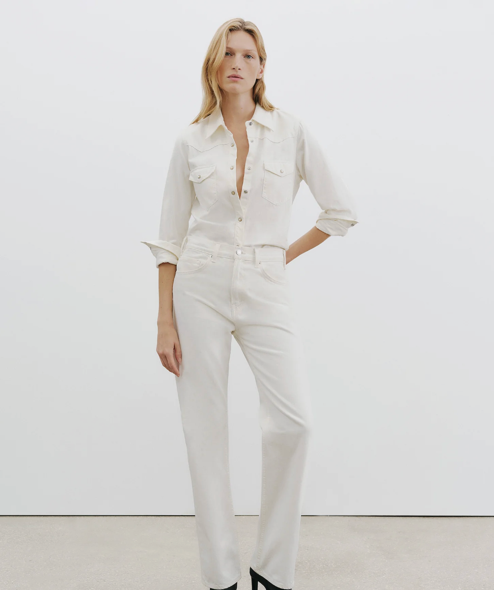 Classic, straight fit collared jean shirt in Japanese denim. Western details. Pearl snap buttons. Chest flap pockets. Standard placket. Centre front buttons. Buttons at cuff.