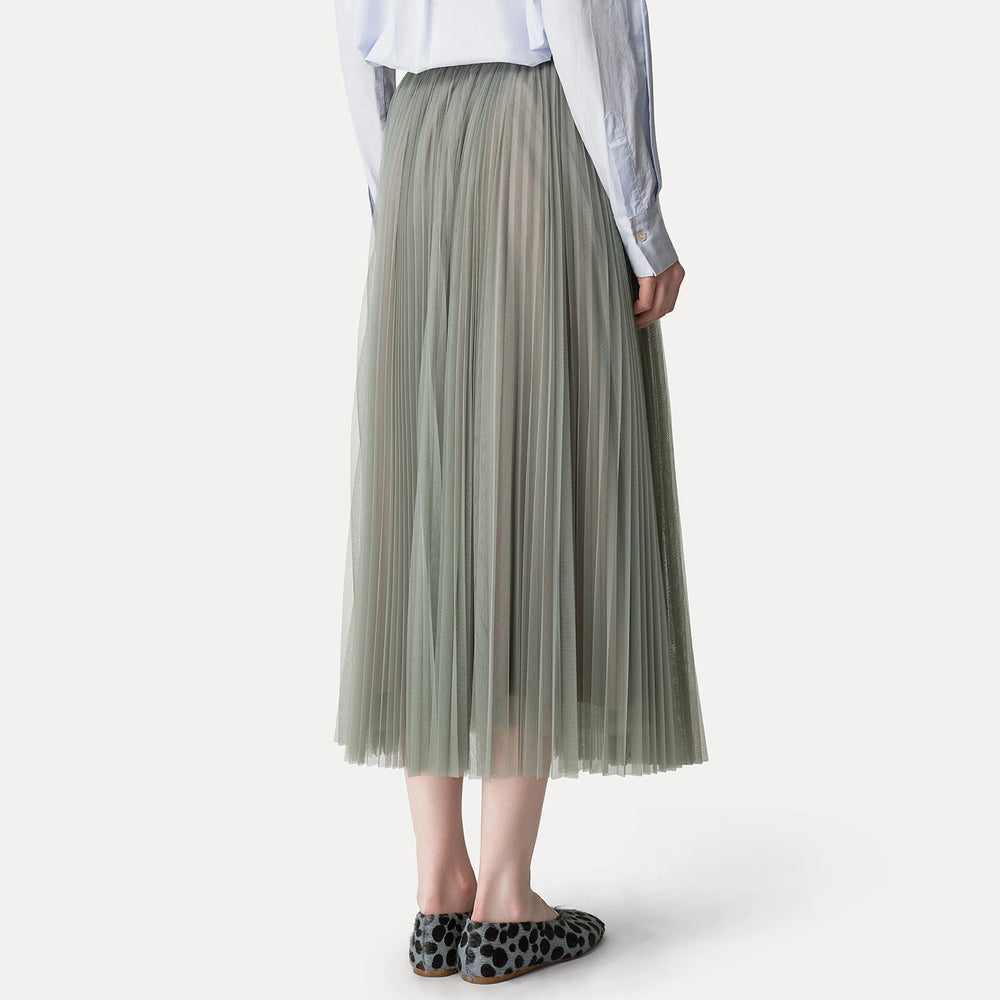 Diaphanous delicacy and gentle feminine flair are the defining characteristics of the tulle skirt with sunray pleating doused in the subtle shades of the season. Completed with an elasticated waistband, it has a double fabric layer and lined interior that create a romantic swishy swirl.