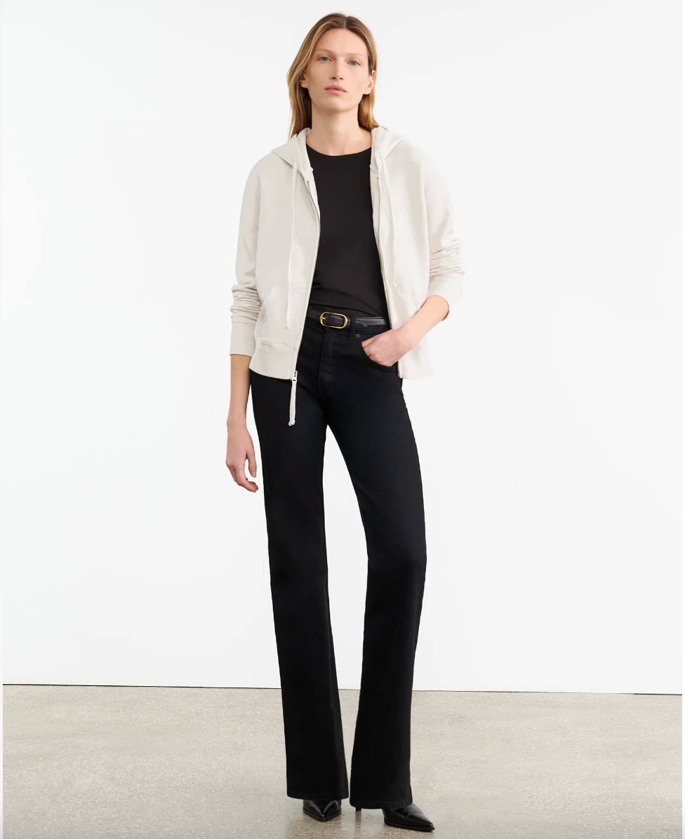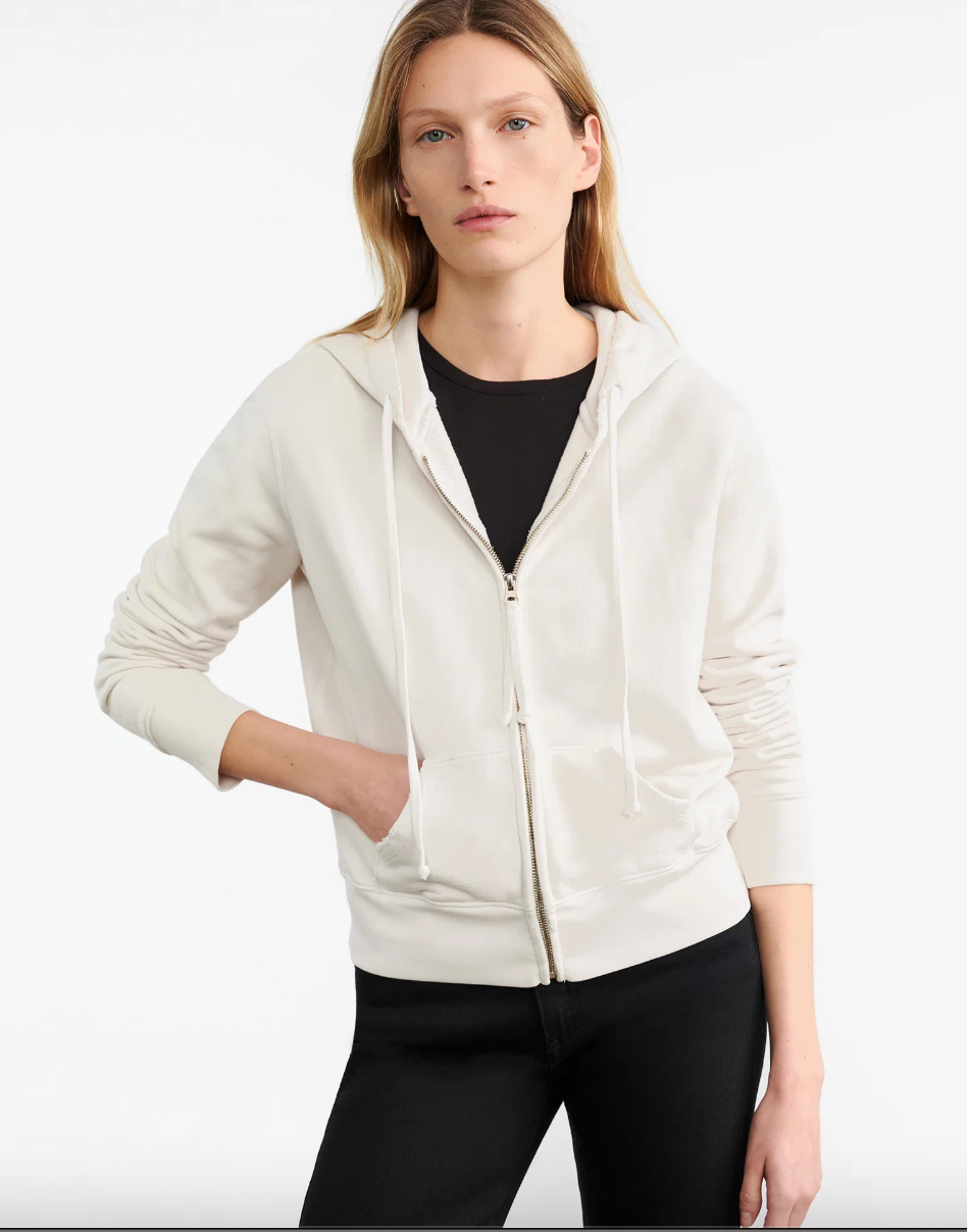 Slightly shrunken regular fit sweatshirt hoodie i cotton. Distressing details and patch pockets. Centre front long draw cord at zipper.