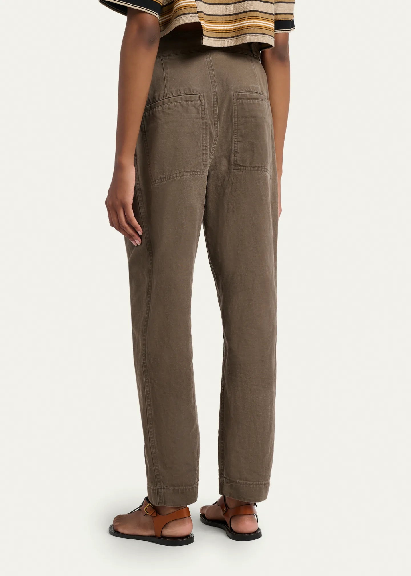 The Neriah pants are crafted from a cotton-linen blend, accented with a paperbag waist cinched with side D-ring buckles. Features a high rise with angled side slip pockets, back patch pockets, a tapered leg and an ankle length
