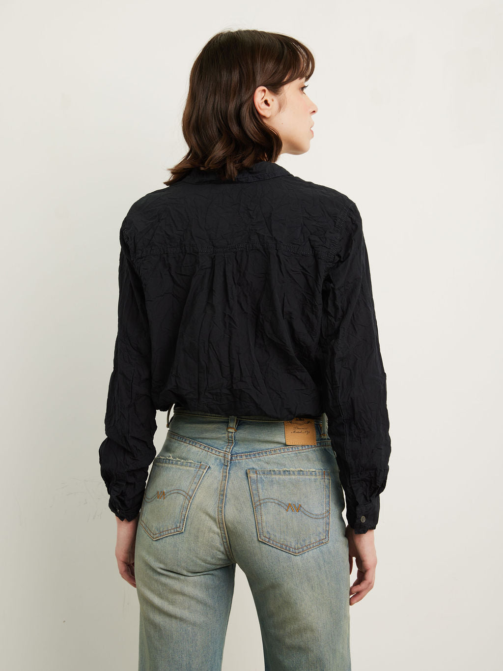 A summer-weight washed cotton crinkle shirt with a regular collar and long sleeves.