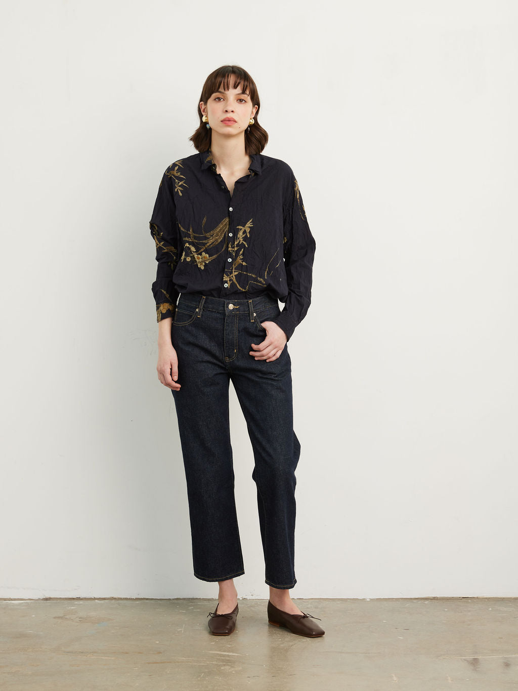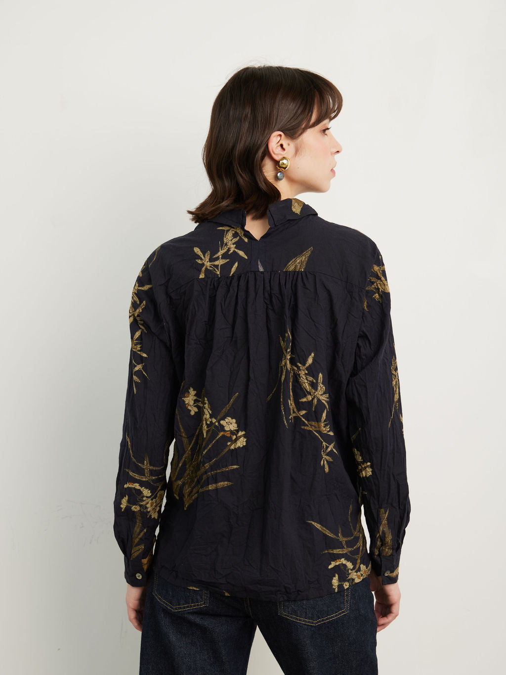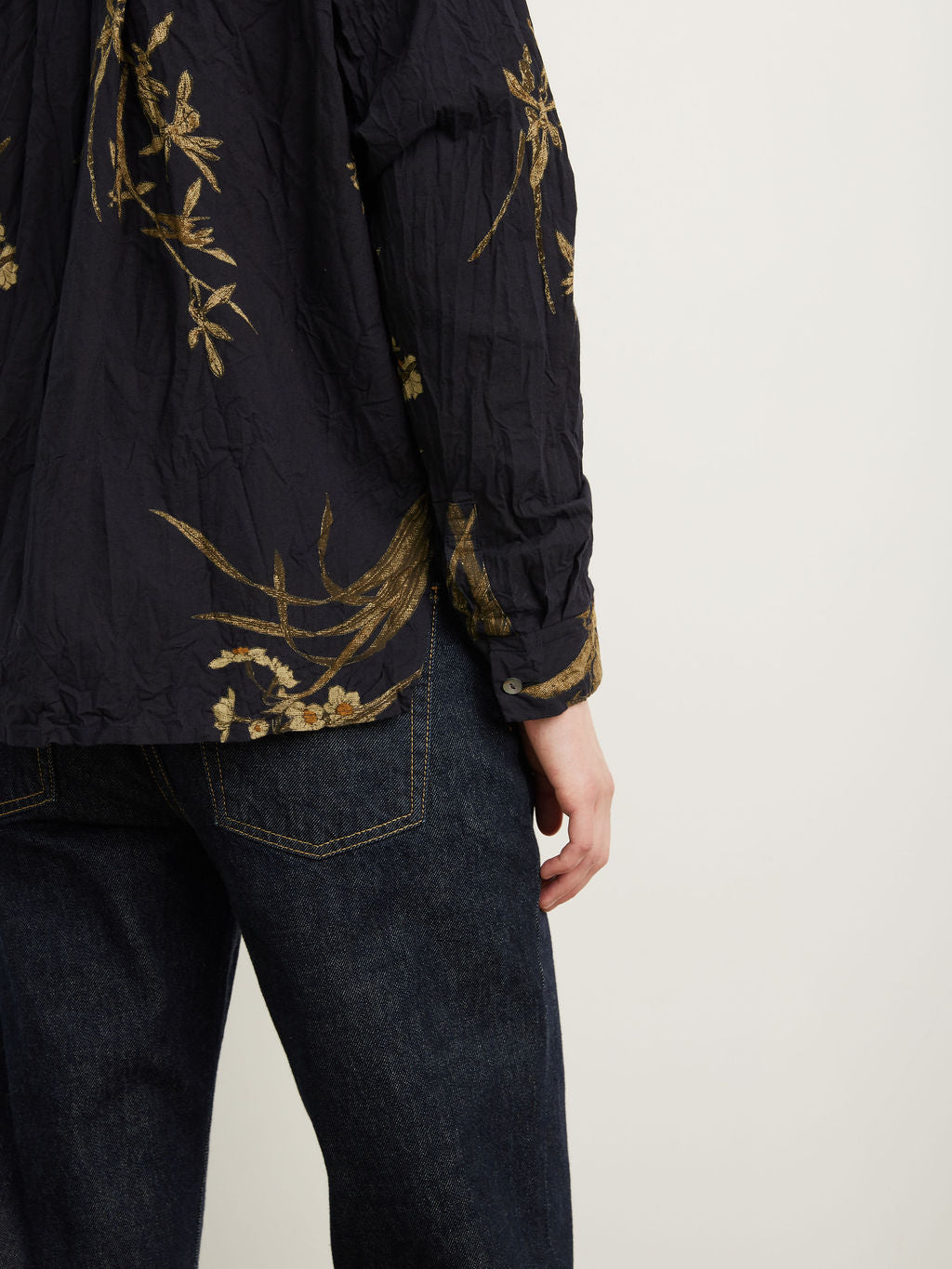 The Japonism Flower Blouse is crafted from a lightweight crinkled cotton. The soft cotton fabric has been printed with a Japanese floral design that evokes a sense of calm. The shirt features a unique collar with split back, a buttoned front, and delicately hand finished treatment to the fabric that creates the pleat-like wrinkles. A soft, airy take on a classic silhouette.