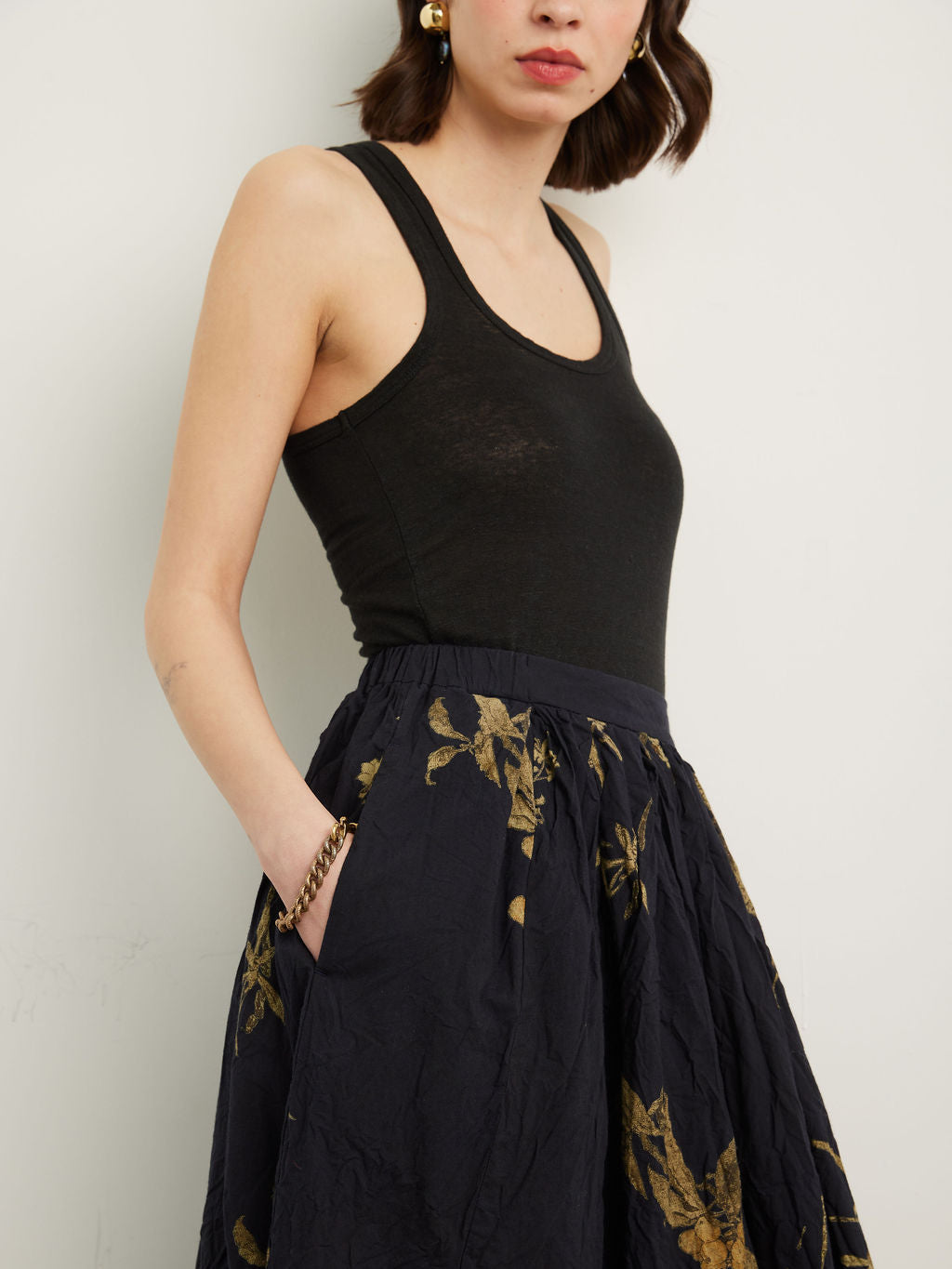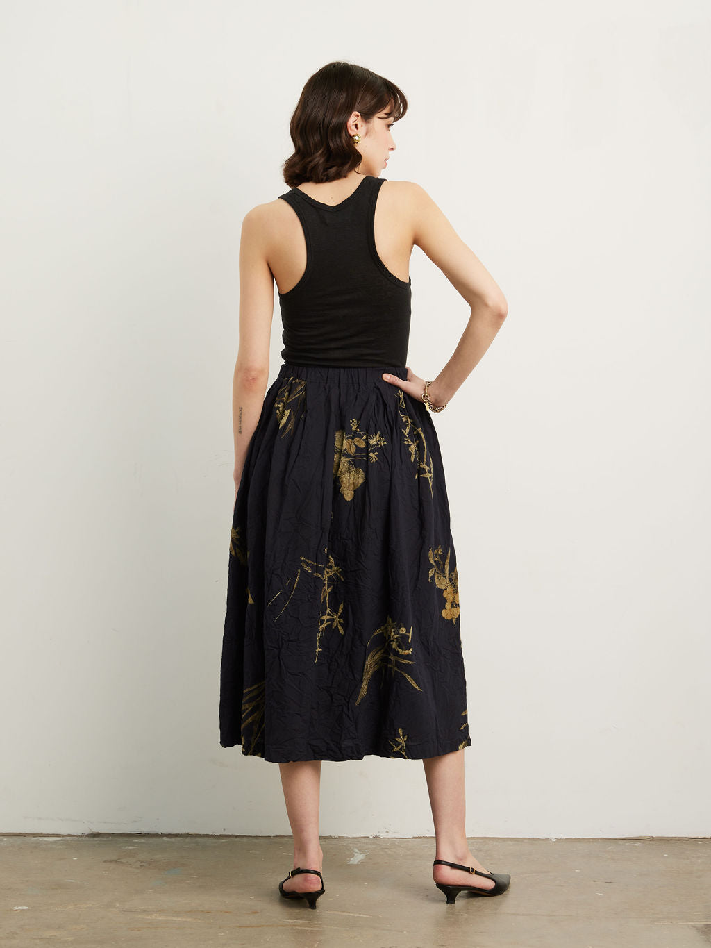 The Japonism Flower Print Skirt is crafted from a lightweight crinkled cotton. The soft cotton fabric has been printed with a Japanese floral design that evokes a sense of calm. The skirt features an elasticated waistband and internal drawstring, with pleating at the waist and delicately hand finished treatment to the fabric that creates the pleat-like wrinkles. A soft, airy take on a classic silhouette.