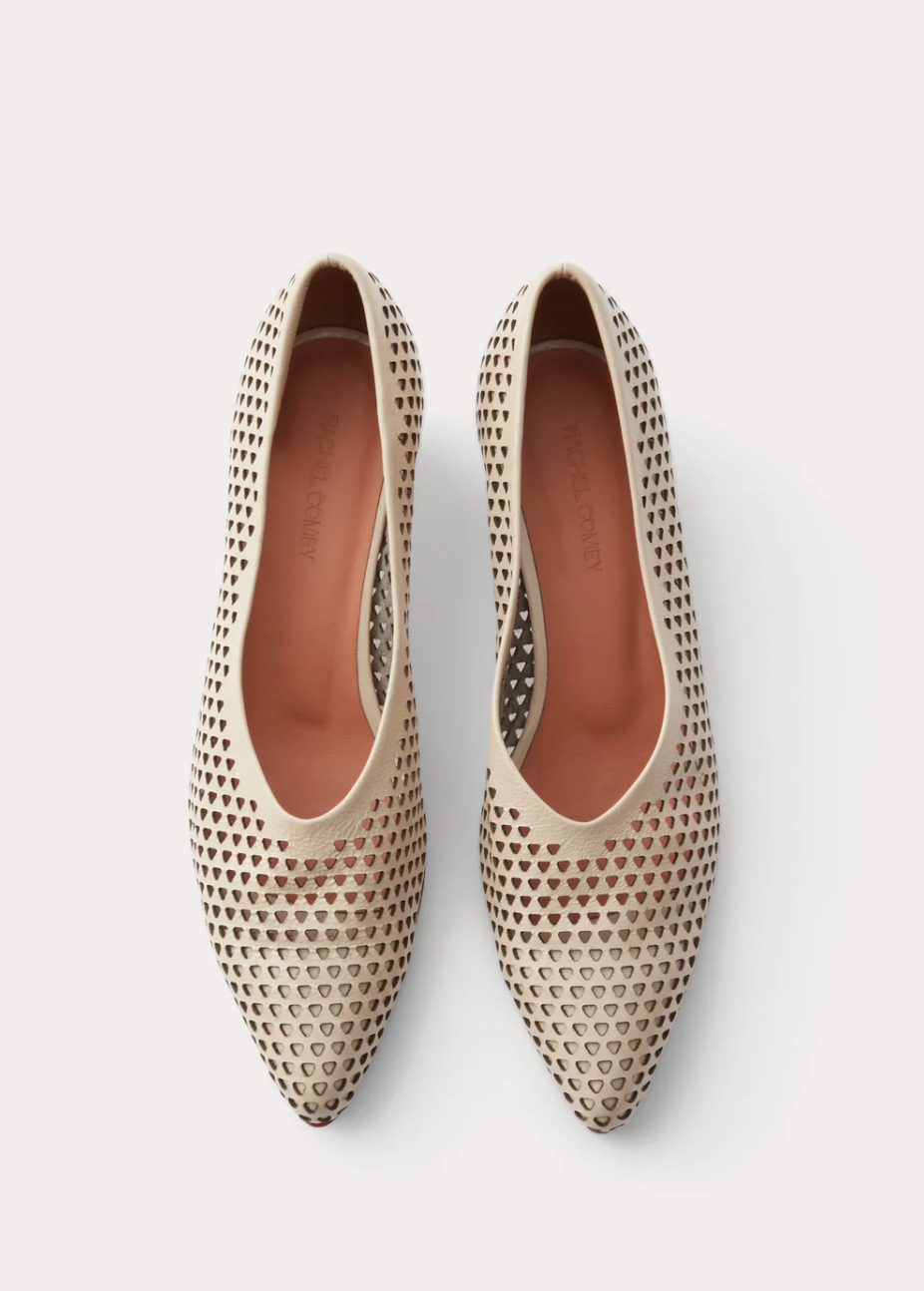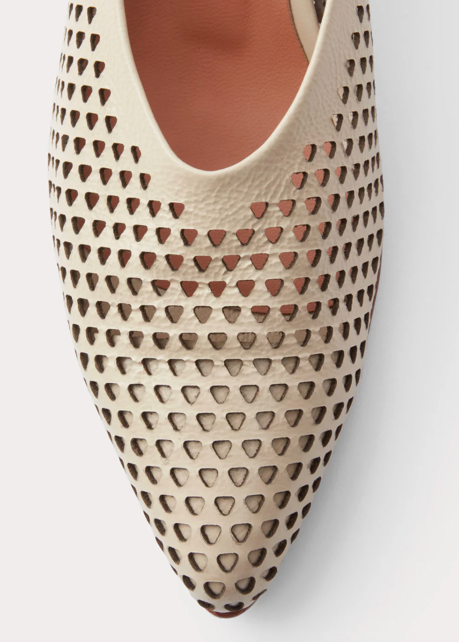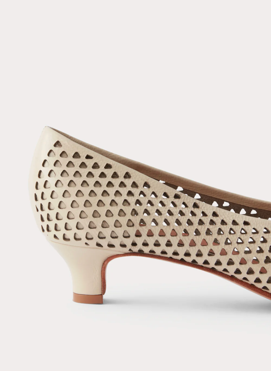 Pointed-toe kitten heel in champagne colour with a perforated triangular design on crinkle patent leather that conforms elegantly to the foot.