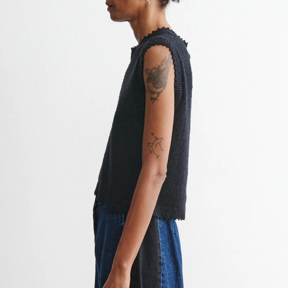 Sleeveless, boxy crewneck top with ribbed trim and ruffled hemline, in Cotton Boucle, a lightweight, textured knit with full body ribbing, spun for summer basics.