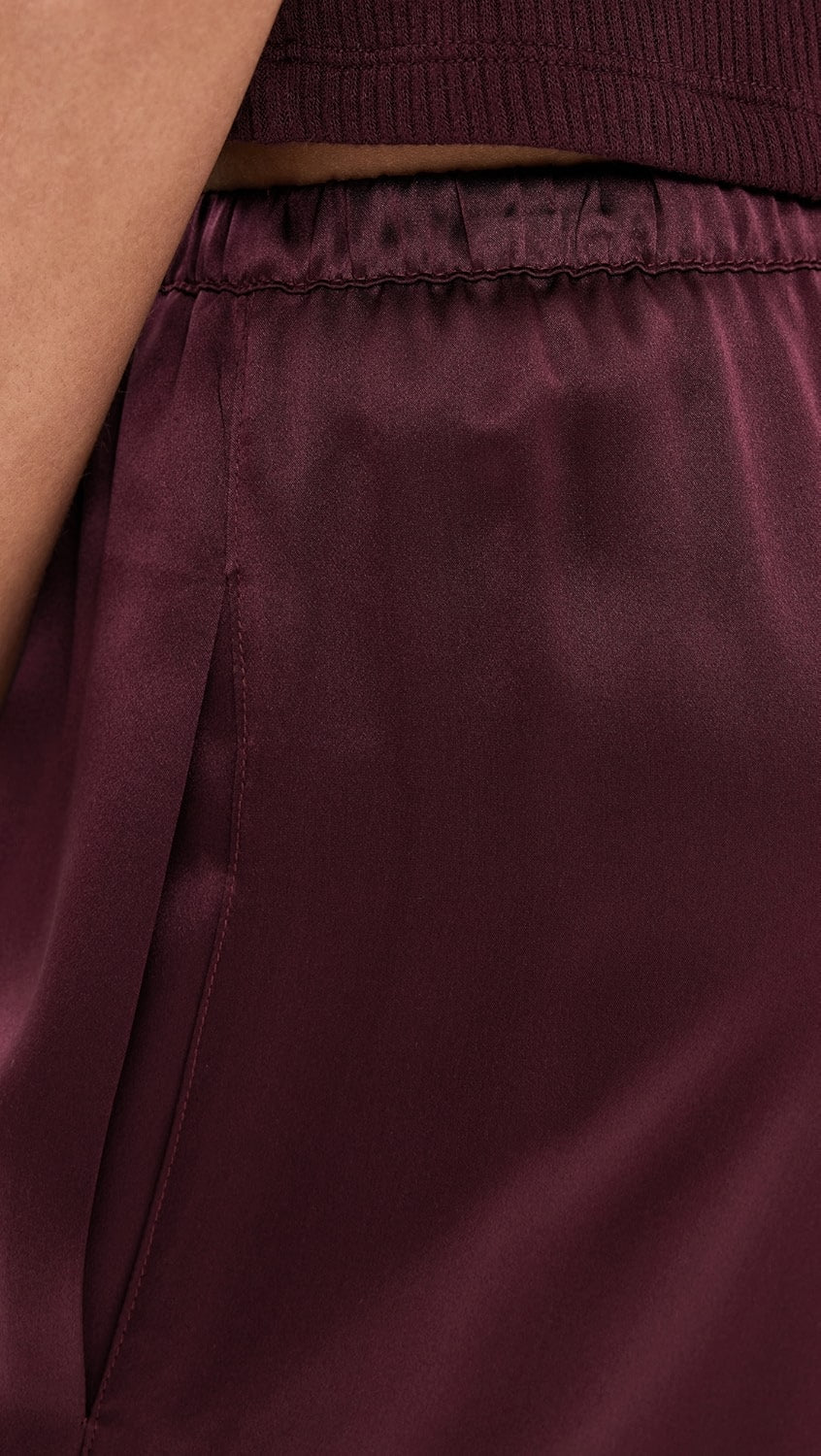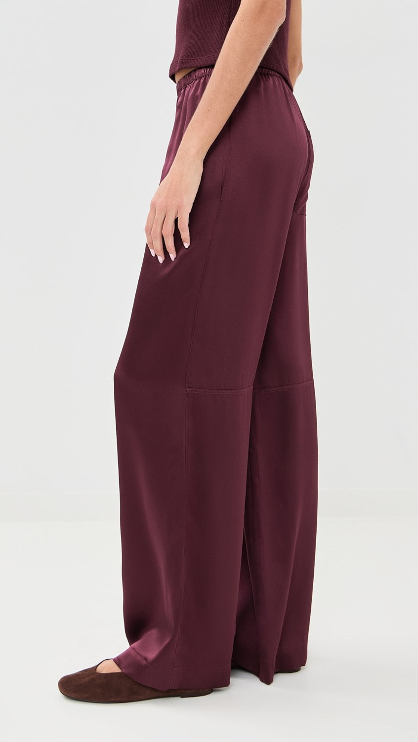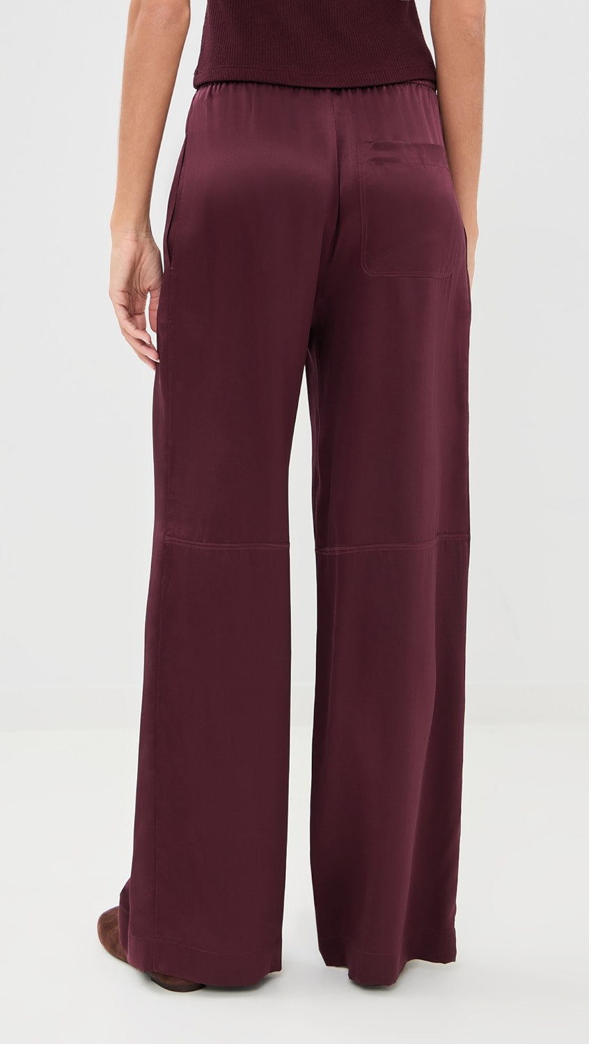 A low rise pull-on pant in 100% silk with a fluid drape, side pockets, one rear pocket and a relaxed fit.