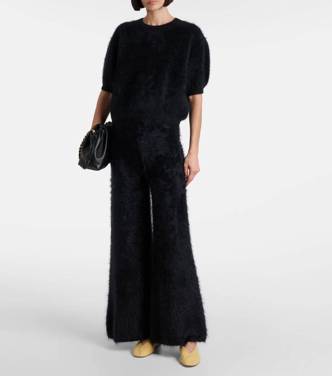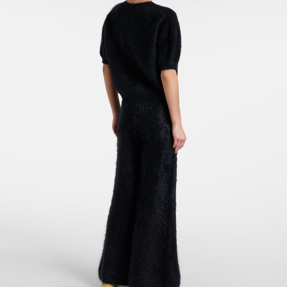 A sumptuous top with texture, the Juniper sweater is knitted in the signature brushed cashmere, drawing from the sheen and lustre of mohair. The generous fit, slightly cropped silhouette is complete with a crew neck, dropped shoulders and short sleeves.