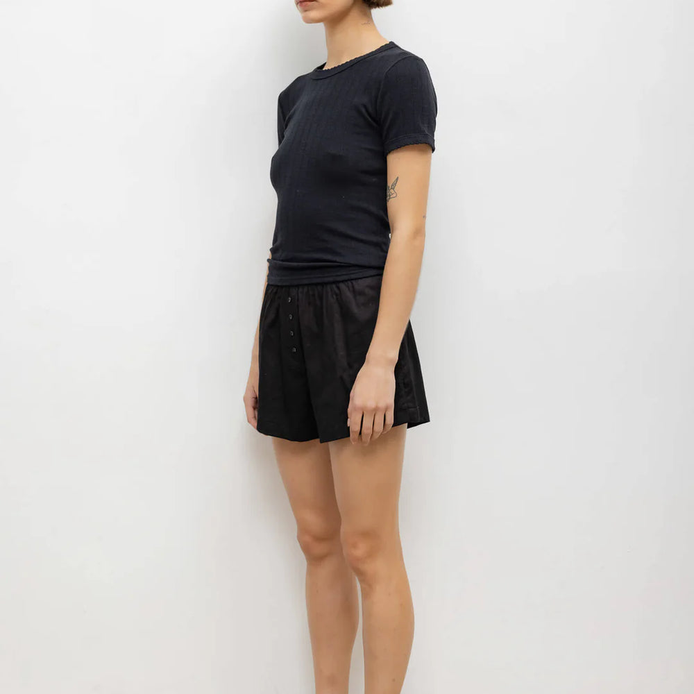 Cut in nostalgic pointelle cotton, the Pointelle Slim Tee features a classic crew neckline with signature pinhole stripes, dainty eyelets and scalloped edging.
