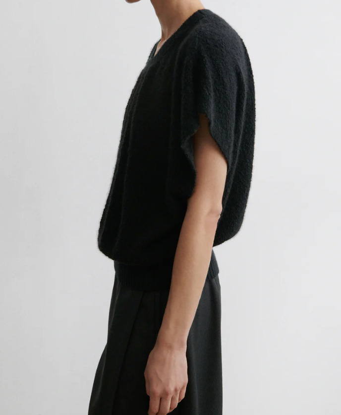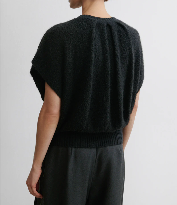 Knit from a luxurious blend of cashmere and wool, this top is designed with a nubby rib bouclé texture. Features a relaxed, blouson silhouette with a crew neckline and softly draped pleats radiating from the collar. The short, wide sleeves add to the ease of layering while the ribbed hem sits close to the waist, creating a softly gathered effect.